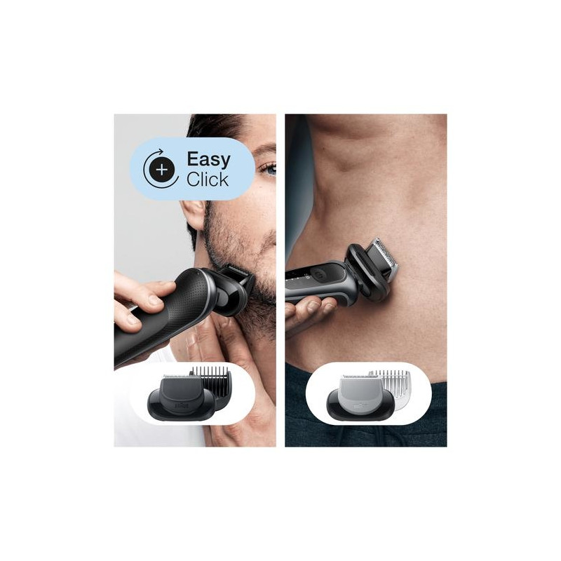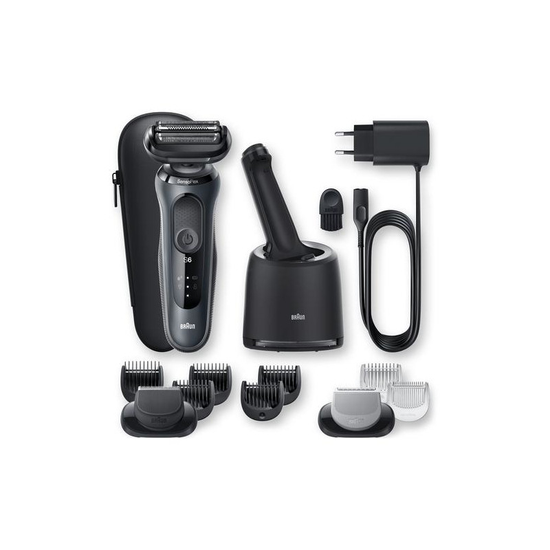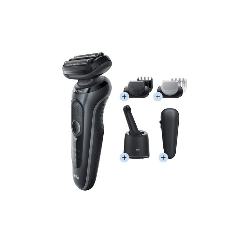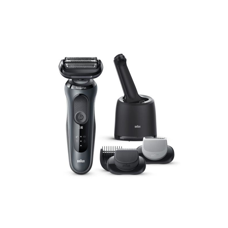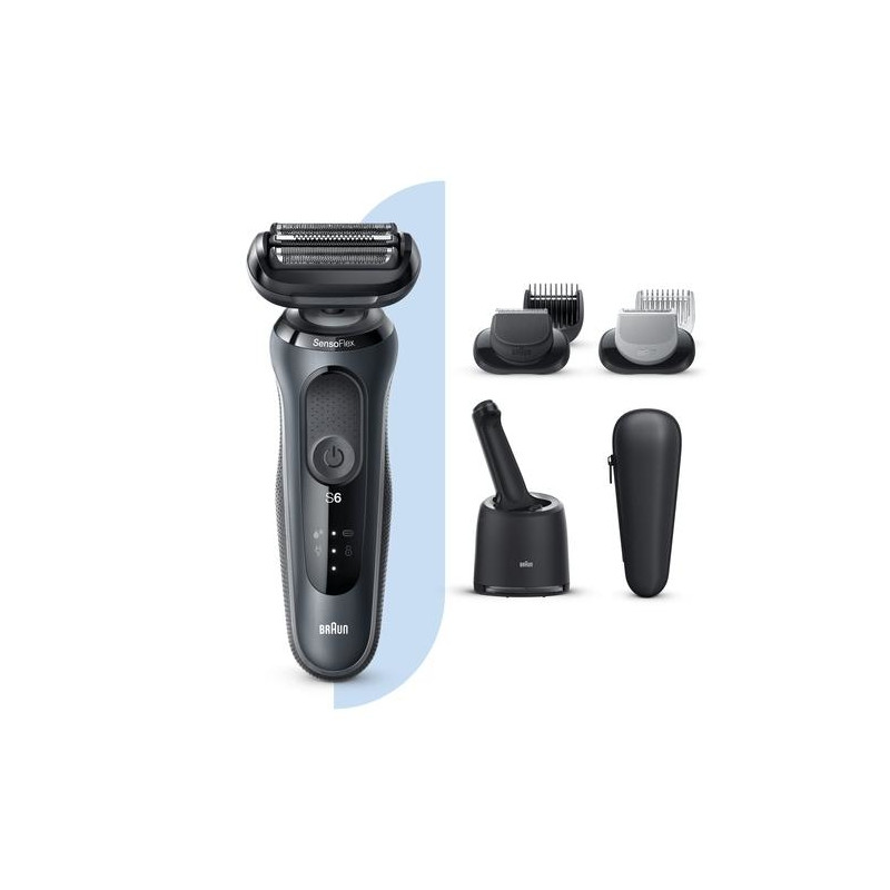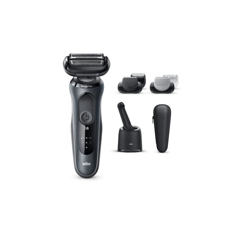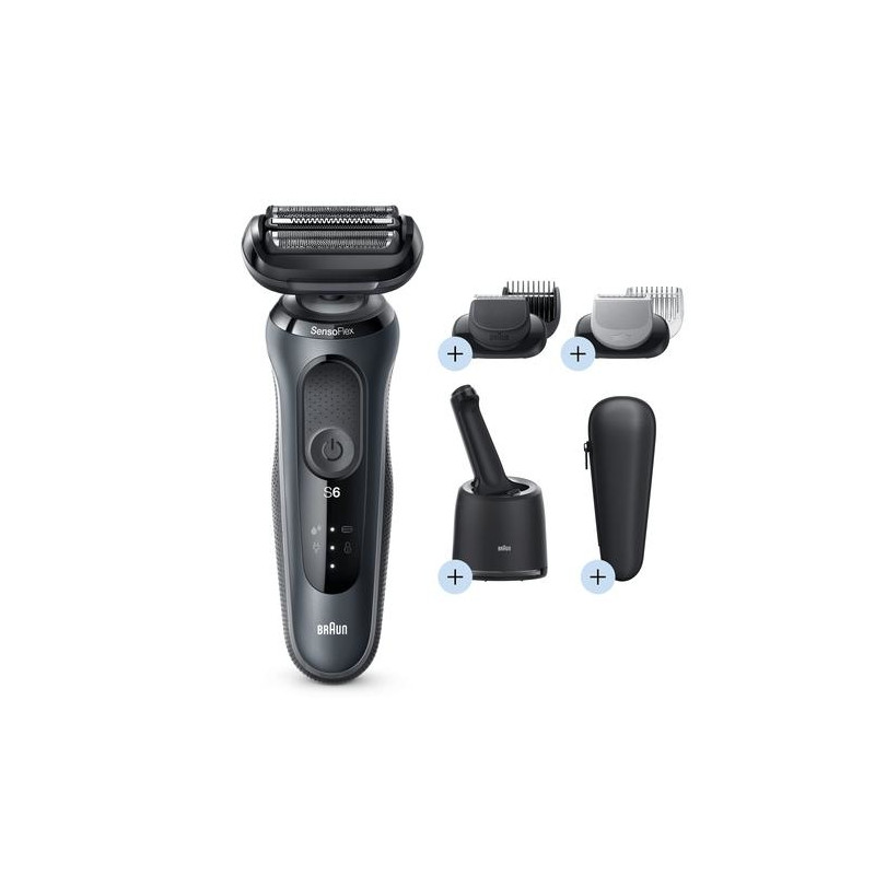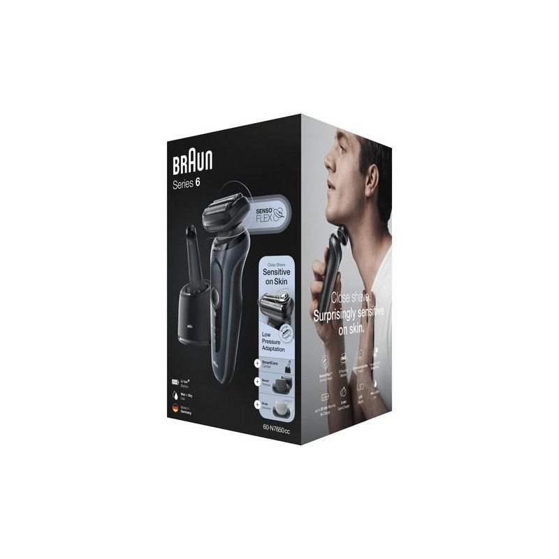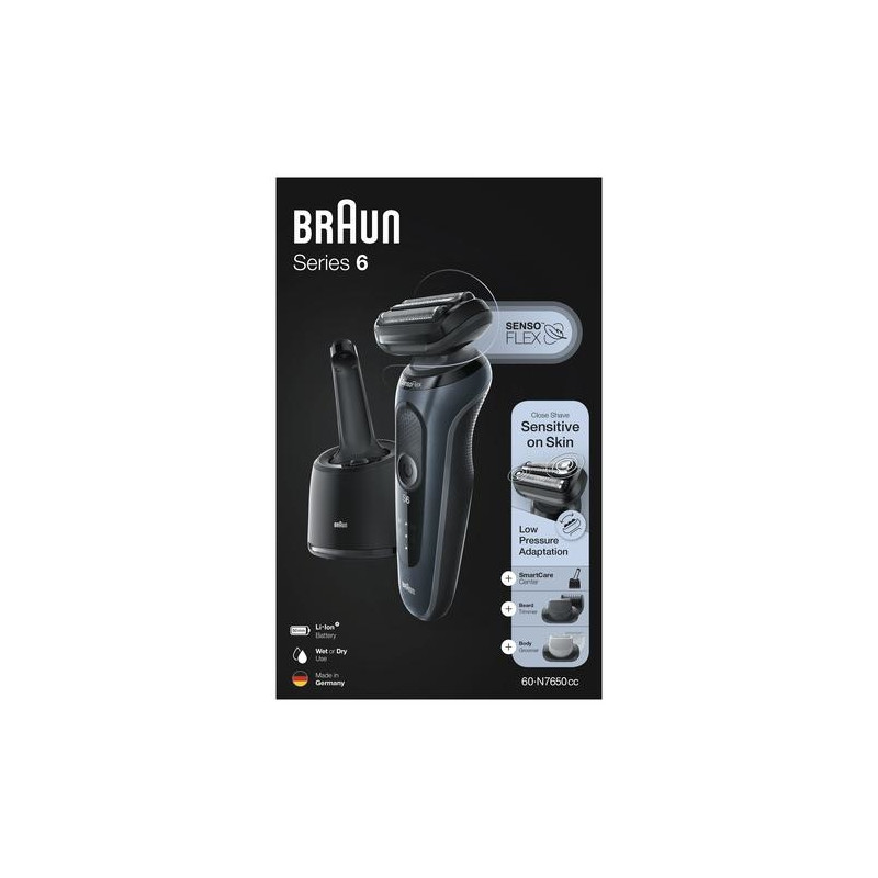 Braun Series 6 60-N7650cc. Shaver system: Foil shaver, Shaving system technologies: Senso Flex, Blade material: Stainless steel. Product colour: Grey, Display type: LED. Power source: Battery, Battery technology: Lithium-Ion (Li-Ion), Battery type: Built-in battery. Weight: 977 g, Battery weight: 18.6 g. Shaver base station functions: Charging, Cleaning, Attachment combs: Body, Beard