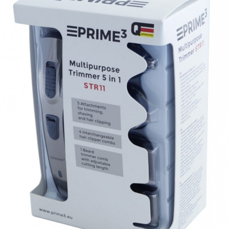 Kliendi ootustele vastamiseks otsustas PRIME3 bränd disainida mitmeotstarbelise trimmeri STR11. Tänu viiele vahetatavale otsikule raseerimiseks, trimmimiseks ja juuste lõikamiseks saab see hõlpsasti hakkama taltsutamatu habeme või juustega. Kui soovite saavutada soovitud soengut, on neli vahetatavat lõikekammi (3mm, 6mm, 9mm, 12mm) asendamatud. Kui vajate habeme kujundamist, on reguleeritava lõikepikkusega habemekamm (3-5mm) käepärane. Komplekt sisaldab ka kõrvade ja nina trimmerit, kulmude trimmerit ja mini foolium pardlit. Kõik see kokku moodustab täielikult varustatud hoolduskomplekti.