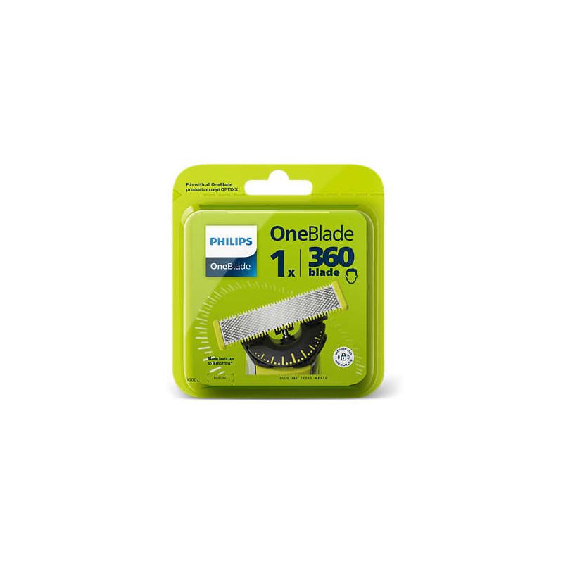 See pakend sisaldab ühte Philips QP410/50 OneBlade 360 -vaihtotera, mis on mõeldud kasutamiseks kõigi OneBlade ja OneBlade 360 habemeajajatega. Vahetage tera iga 4 kuu tagant, et tagada optimaalne jõudlus ja mugav raseerimine.