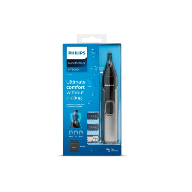 The Philips nose trimmer series 3000 comfortably trims nose, ear and eyebrow hair. The new PrecisionTrim technology and the Protective Guard system have been designed to provide an easy and efficient trim without all the pulling and tugging.