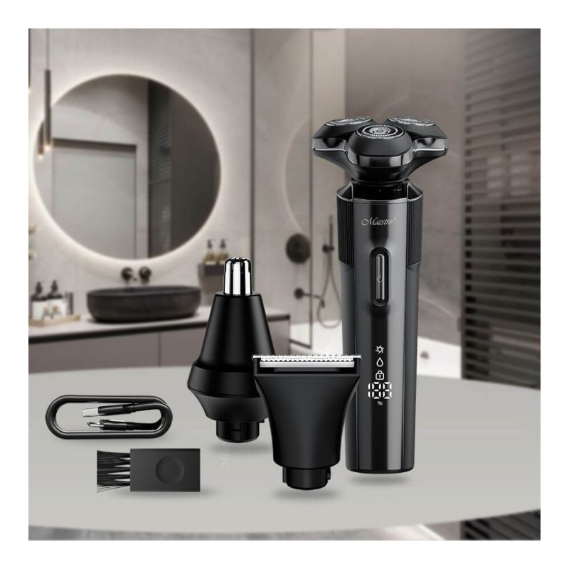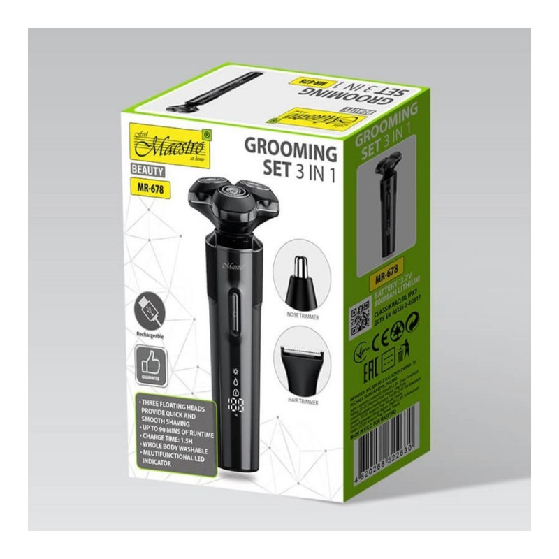 Maestro 3-in-1 USB-C pardlikomplekt MR-678 on innovaatiline seade, mis ühendab endas pardli, nina- ja kõrvakarvade trimmeri ning juukselõikuri funktsioonid.