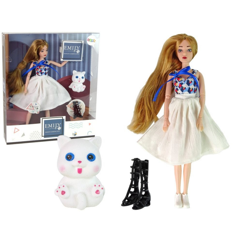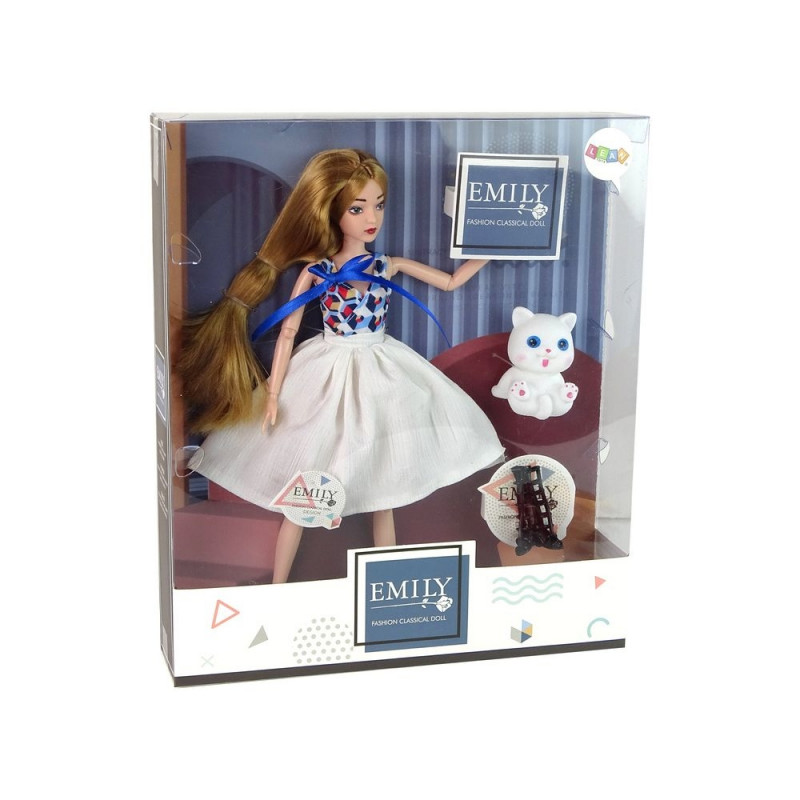 Nukk Emily koos armsa valge kassiga on erakordselt võluv komplekt väikestele nukusõpradele. Emily nukul on kaunid juuksed ning pikk valge-sinise mustriga kleit ja mustad kingad. Komplektis on ka armas kass ning lisaks valged vahetuskingad, mida saab vastavalt soovile vahetada.