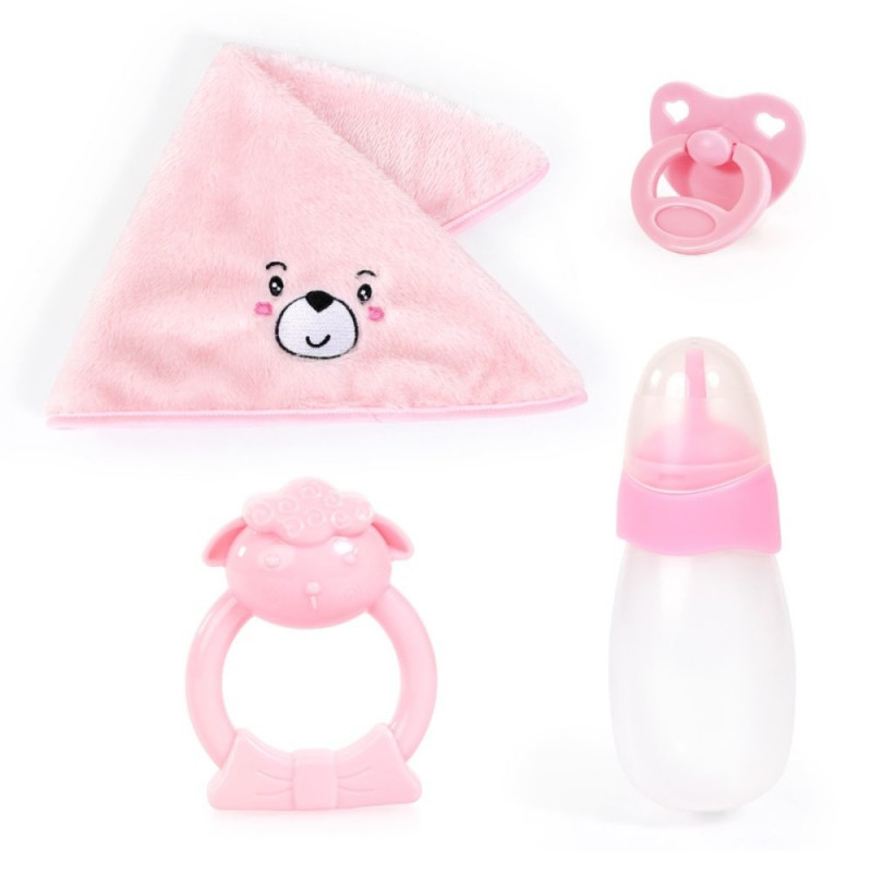 Seljas on pehme roosa kõrvadega kombe. Lisaks on komplektis lutt ja pudel.