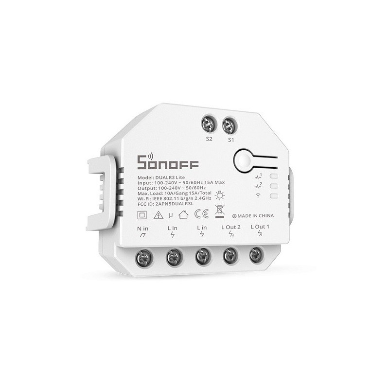Specifications: Voltage: AC 110~240V. Current max.: 15A total max, 10A for 1 channel. Power: 3300W total max, 2200W for 1 channel. Frequency: 50-60Hz. Wi-Fi Frequency: 2.4 GH. Wi-Fi standard: IEEE802.11b/g/n. Number of channels: 2. Works with Amazon Alexa & Google Assistant. Security: WPA-PSK/WPA2-PSK. App: eWeLink (Android, iOS). Dimensions: 54x49x24mm. Housing material: PC V0 (non-flammable). Operating temperature: -10°C~40°C. Humidity: 5%-95%. Weight: 58 g. Colour: white. Certification: CE/ FCC/ RoHS/ TUV.