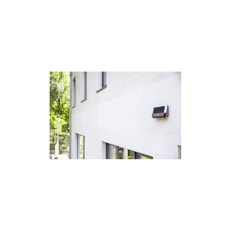The Bosch Smart Home outdoor siren deters intruders and gives a triple alarm in an emergency - with a 100 dB siren, red flashing LEDs and a push message. The siren is powered by the integrated solar panel and can therefore be flexibly placed outdoors. The integrated backup battery, which can be charged via the solar panel, stores enough solar energy for the night and cloudy days to reliably sound the alarm even when there is no sun. Alternatively, the siren can also be connected to a 230 V power line or low-voltage line (5-28 V).