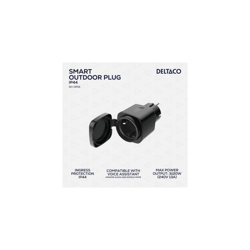 SH-OP01 is a smart outdoor plug that can be easily switched on or off via your phone or tablet, both at home or at a distance. SH-OP01 can be used for all devices with the correct plug. Thanks to the fact that it is IP44-rated, the electronics inside are protected from any water splashes, which makes it perfect for e.g. the engine heater, outdoor lights or in wet rooms.<br><br>With the DELTACO SMART HOME app you can handle all the operation for the outdoor plug. The app is very easy to install, the only thing you need is a functioning wireless network (2,4GHz) and therfore no special hubs or gateways. In the app, in addition to just turning the plug on or off, you can also set a timer if you want the plug to turn off after a certain time. Alternatively, you can schedule specific times when it should be turned on or off. The DELTACO SMART HOME app also offers the possibility to create automatic actions. For example, the plug can be turned off when the sun goes down, or you can group several plugs together to perform the same thing at a given time. The DELTACO SMART HOME app is of course available for free download for both Android and iOS.<br><br>SH-OP01 can also be connected and controlled manually or via voice control with Google Home or Amazon Alexa, to easily be integrated and become a part of the smart home.Deltaco SH-OP01. Placement supported: Indoor, Product colour: Black. Connectivity technology: Wired, Wireless technology: Wi-Fi, Frequency range: 2.4 - 2.4 GHz. Maximum input power: 3120 W, AC input voltage: 220-240 V, Compatible power plug types: EU. Width: 52 mm, Depth: 81 mm, Height: 52 mm. Quantity per pack: 1 pc(s)