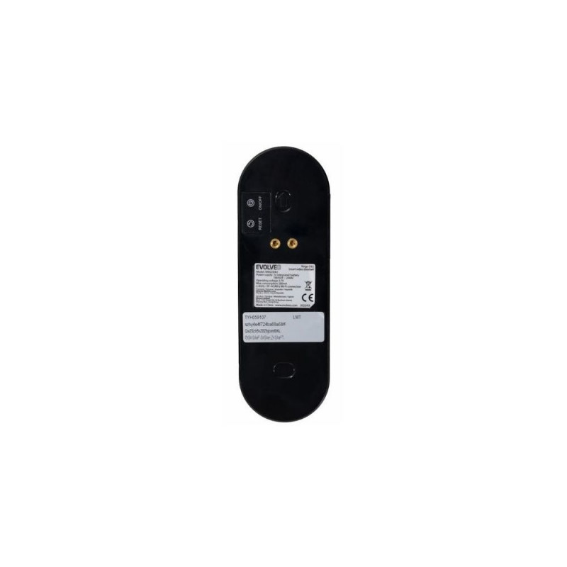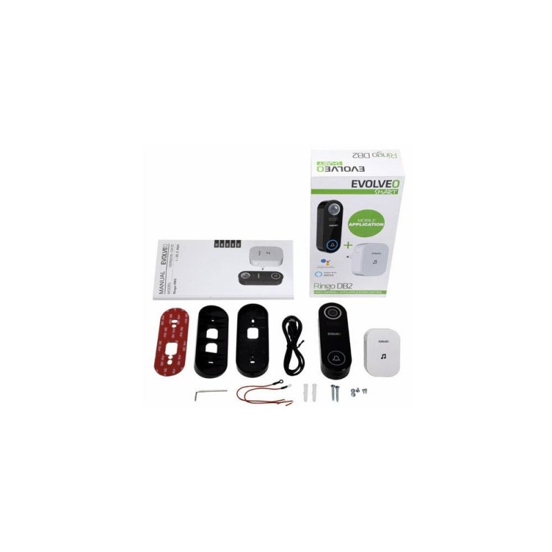 <b>Wireless video doorbell with Wi-Fi connection</b><br>Check your doorstep from anywhere. Use the Android and iOS app to keep track of all your visitors. With your smartphone, you can just check on the newcomer, or you can initiate two-way communication and, for example, notify the newcomer of your absence.<br><br><b>Daytime, nighttime monitoring</b><br>With person detection, a 130° viewing angle and alerts sent, you'll be aware of who's around your door. The Ringo DB2 has an infrared illuminator, so the area is monitored even at night. In the app you can check the area in real time, remotely turn on the alarm siren, or initiate a call to fight off a potential burglar in person.<br><br><b>Connection and pairing</b><br>Pair the Ringo DB2 to your home Wi-Fi network via the Wi-Fi module and using the mobile app. The pairing itself takes only a moment, and controlling the video doorbell with the app is intuitive and straightforward. The outdoor doorbell is connected to the indoor doorbell using a 443MHz RF module. No additional cabling is required.<br><br><b>Installation and charging</b><br>Simply place the video doorbell in the desired position using the included mounting brackets. Thanks to the supplied flat and angled mounting frames, you achieve optimal installation according to your needs. Insert the video doorbell into the attached mounting frame and secure it with the safety screw. The Ringo DB2 has two integrated 18650 alkaline batteries that last up to half a year on a single charge. You can check the battery status directly in the app, or turn on a charge alert. This is easily done with the included microUSB cable. You can also use the included cables to power directly from the mains.Evolveo Ringo RINGODB2. Product colour: Black. Connection type: Wireless, Wi-Fi frequency: 2.4 GHz, Wi-Fi standards: 802.11b, 802.11g, Wi-Fi 4 (802.11n). Maximum video resolution: 1920 x 1080 pixels, Viewing angle: 130°. Compatible memory cards: MicroSD (TransFlash), Maximum memory card size: 128 GB. Power source type: Battery, USB, Battery technology: Alkaline, Battery type: Built-in battery
