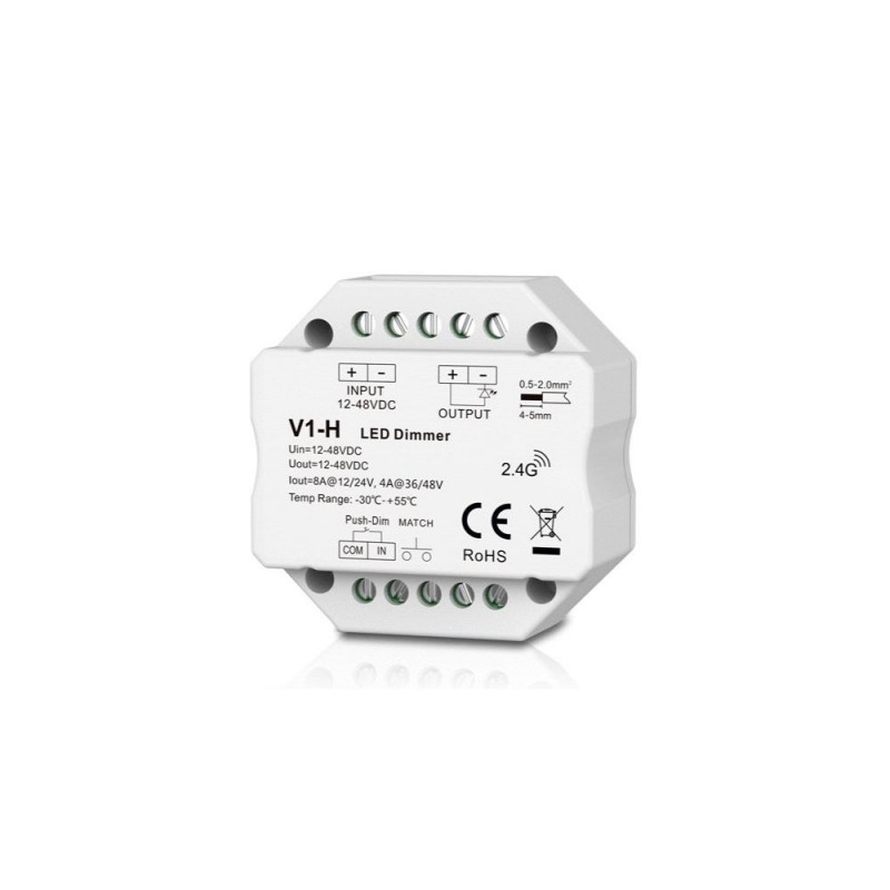 Technical specifications:Product model: V1-H.Number of channels: 1.Controlled lighting systems: single-color.Operating frequency: RF 2.4GHz.Input voltage: 12V-48V DC.Output voltage: 12V-48V DC.Output current: 8A@12/24V; 4A@36/48V.Power: 96W@12V; 192W@24V; 144W@36V; 192W@48V.PWM frequency: 500Hz.Grey scale: 4096 levels.Dimming range: 0-100%.Dimming curve: logarithmic.Operating distance: up to 30m (open area).Protection class: IP20 (non-waterproof).Suitable wire cross-section: 0.5–2 mm².Certifications: CE, EMC, RoHS.Operating temperature: -30~+55°C.Dimensions: 52 x 52 x 26 mm.Color: white.Weight: 49g.