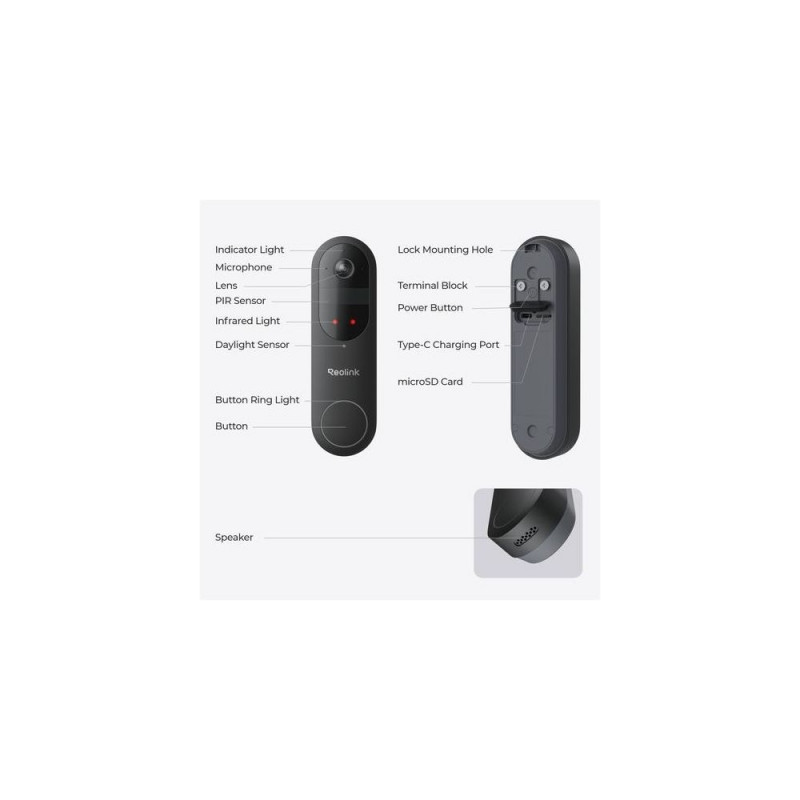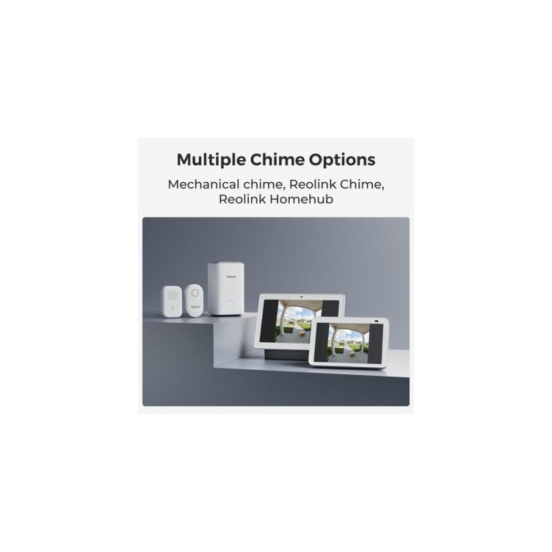 Smart guard right at your door, Reolink D340B, video doorbell for outdoor use.<br>Enjoy a 4MP 150°x150°x180° head-to-toe view for unparalleled visibility.<br>Stay in the know with smart person/vehicle/package detection and visitor notification.<br>Engage in real-time conversation with two-way audio.<br><br><b>1:1 Aspect Ratio + 4MP HD</b><br><br>Experience 2K HD with a unique 1:1 aspect ratio, delivering a 150°x150°x180° head-to-toe view for exceptional front door visibility.<br><br><b>Smart Detection + Instant Alerts</b><br><br>When people, vehicles, or packages are detected, you will be notified by the real-time notification. Fear no more porch pirates, your packages are always under monitoring.<br><br><b>Rechargeable Battery + Hardwire</b><br><br>Flexible power options. Use the rechargeable battery or hardwire to existing wiring. The hardwire option supports mechanical chimes. (Power source: 8~24V, 5VA-40VA).<br><br><b>Dual-Band Wi-Fi Network</b><br><br>Supports both 5GHz and 2.4GHz Wi-Fi., meeting your diverse connectivity needs. 2.4GHz band offers extensive coverage, while 5GHz frequency delivers rapid network speeds.<br><br><b>Visitor Notification</b><br><br>Receive instant push notifications and even a video call when a visitor presses the doorbell. See their faces on the screen without having to open the door.<br><br><b>Multiple Chime Options</b><br><br>Whether you opt for Reolink Chime, a traditional mechanical chime, Google Assistant, or Reolink Home Hub, rest assured that our doorbell will complement your home environment.<br><br><b>Two-Way Audio + Quick Reply</b><br><br>Engage in real-time communication with visitors via two-way audio. Pre-recorded quick replies add convenience, letting them speak for you whenever needed.<br><br><b>Reliable Guardian in Any Weather</b><br><br>Designed to withstand the elements, this weatherproof doorbell provide reliable outdoor protection against dust and water.<br><br><b>HDR Tech</b><br><br>HDR technology dynamically adjusts the exposure to enhance image quality, ensuring clear and detailed visuals even in challenging lighting conditions.Reolink D340B. Megapixel (approx.): 4 MP, Maximum video resolution: 2048 x 2048 pixels, Sensor type: CMOS. LED type: IR. Audio system: 2-Way. Product colour: Black. Compatible memory cards: MicroSD (TransFlash), Maximum memory card size: 256 GB