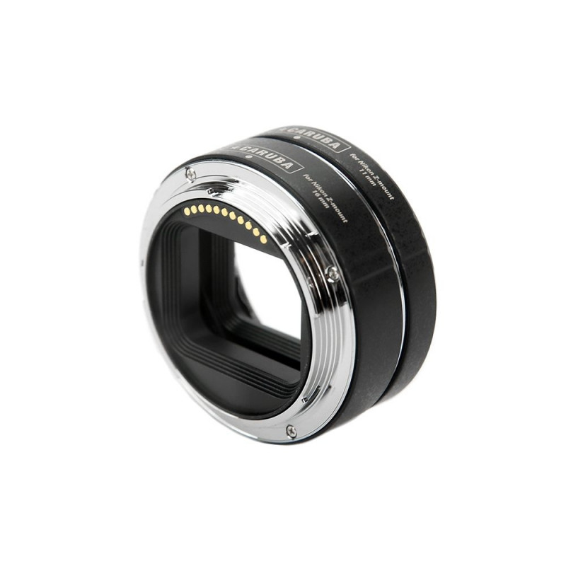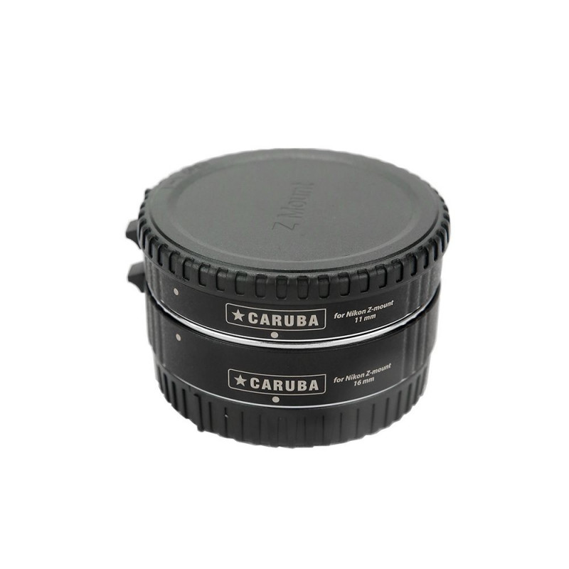 Caruba pikendusadapterite komplekt Nikonile koosneb kahest pikendusadapterist, mida saab kasutada eraldi või omavahel kombineeritult. Adapterites ei ole optilisi elemente, mis võimaldab pildistada objekte suuremalt ja lähemalt, ilma et pildikvaliteet muutuks. Adapteritel on kroomitud kinnitus ning need on ühilduvad Nikon Z objektiividega. Sellised funktsioonid nagu automaatteravustamine ja TTL valgusmõõtmine töötavad endiselt tavapäraselt. Siiski on soovitatav kasutada käsitsi teravustamist, kuna teravustamisulatus on väga väike.