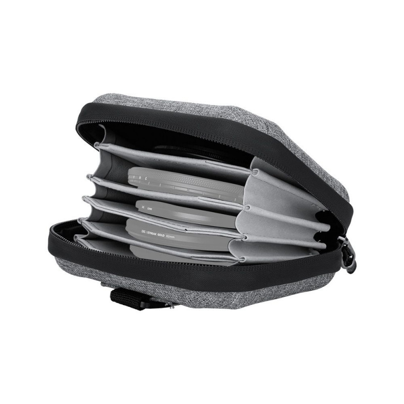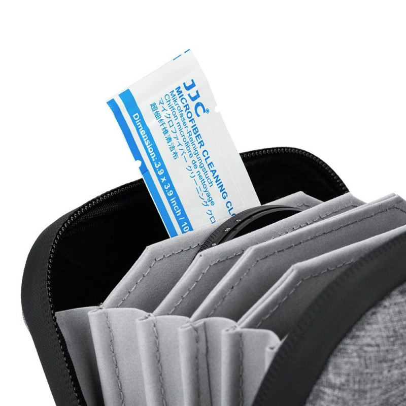 Filtritasku välispind on valmistatud kvaliteetsest EVA-materjalist, mis on tugev ja vastupidav. Taskus olevad filtrid paiknevad eraldi mikrokiust voodriga sektsioonides, mis tagavad lihtsa ligipääsu luku avamisel. Kõiki filtreid on korraga näha ning neid saab kiiresti taskust välja võtta ja tagasi panna. Lisaks on filtritaskuga kaasas vaakumpakendis mikrokiust puhastuslapp, mis eemaldab tõhusalt tolmu, sõrmejäljed ja õliplekid, jätmata jälgi.