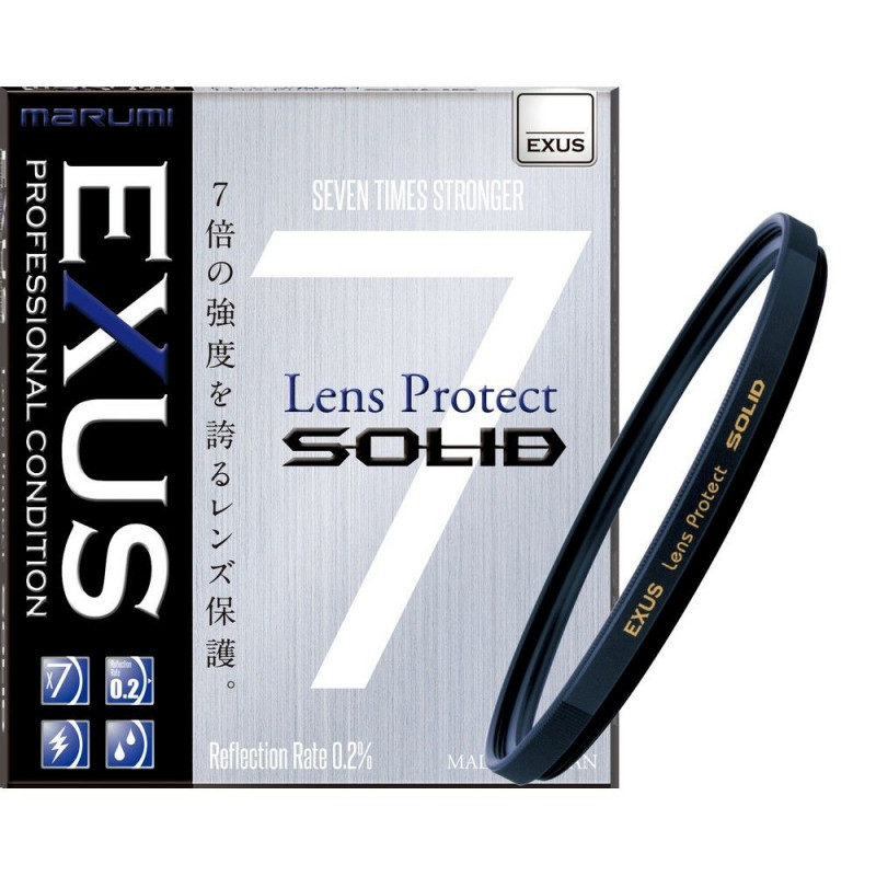 Marumi EXUS SOLID filter on karastatud klaasist valmistatud kaitsev objektiivifilter. Sellel on madal peegeldustegur ning filter on kaetud hüdrofoobsete ja antistaatiliste kihtidega, mis parandavad valguse läbilaskvust ja kaitsevad objektiivi kahjustuste eest.