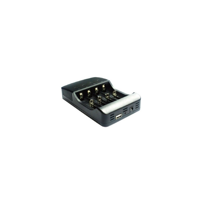 Thanks to unique microcontrollers this intelligent charger can charge batteries with different types (Ni-MH, Ni-Cd, Li-Ion) and capacity at the same time. The charger also automatically detects bad or +/- reversed batteries (the corresponding 4 capacity indicators flashes at the same time). The biggest advantage of this charger is completely independent control of every channel. Power bank function - put the Lithium-ion batteries, the charger can be used for charging smart phones or pad. Integrated reverse charging protection. Technical data: Input: AC 100-240V 50/60Hz DC 12V/1.5A Output: 4.2V 500mAx4 1000mAx2 1.48V 500mAx4 5V 1000ma (USB) Dimensions: 157x93x35mm Weight: 184g Set: Intelligent charger; Power supply cable. Guaranty: 12 monts Importer: Eurodigital