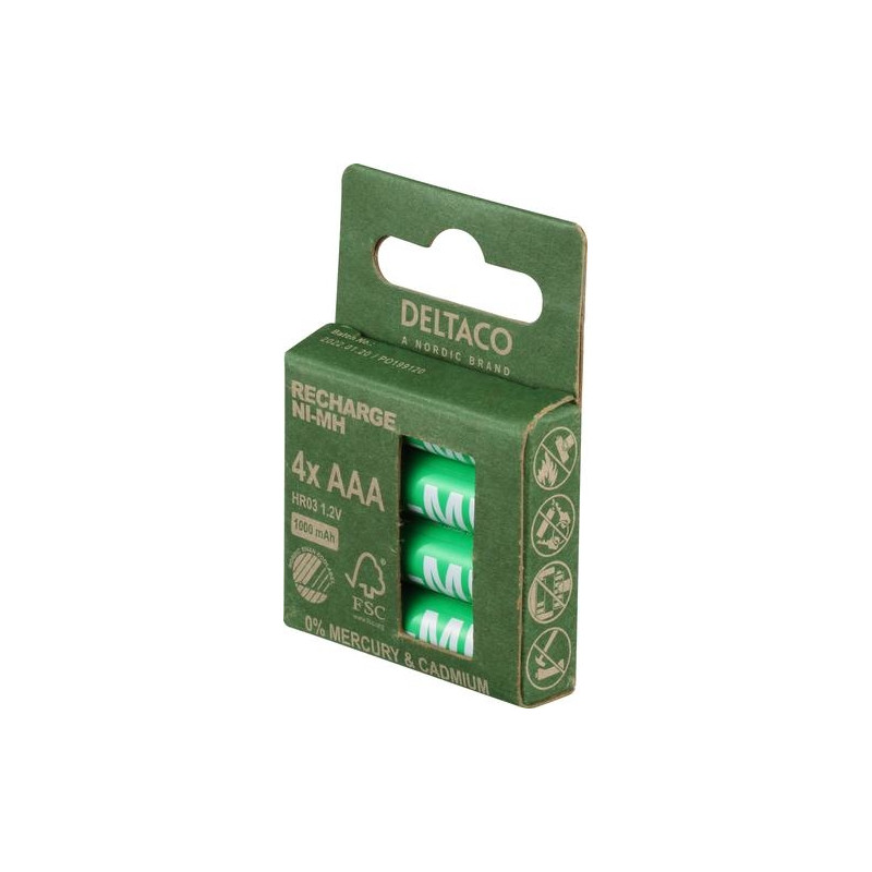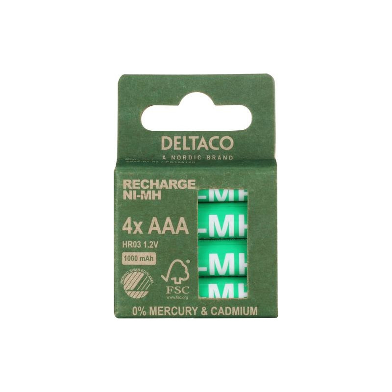 DELTACO Rechargeable AAA batteries, 1000mAh, Nordic Swan Ecolabelled, 4-packNordic Swan Ecolabelled rechargeable AAA batteries (HR03) of the NiMH type. Long-lasting when used in your favorite appliances and toys. But also, long-lasting shelf life, always ready when you need them the most. Of course, our batteries are made with leakage protection. Can be charged with a NiMH battery charger. Will last up to 300 recharges.For use in battery-powered devices from cameras and flashes to radios, flashlights, game controllers, baby monitors and wireless devices. The Nordic Swan Ecolabel is the Nordic region''s official eco-label and they carefully examine the environmental impact of goods and services throughout its life cycle, from raw materials to waste and recycling. The Nordic Ecolabel sets strict climate and environmental requirements, but also requirements on functionality and quality. This together with the minimalist and FSC-labeled package makes our batteries a more sustainable and environmentally friendly choice.Our packages are made without the use of plastic, we are proud to have innovative and 100% fiber-based (carton and paper) packages, and in turn they are made with as little material as possible and as small as possible, which results in a more sustainable package. There is 0 % mercury, lead, and cadmium in our batteries, making every purchase a more responsible choice and of course less environmental impact. Storage temperature is: 10°C to +40°CDeltaco ULT-NH1000AAA-4P. Battery type: Rechargeable battery, Battery size(s): AAA, Battery technology: Nickel-Metal Hydride (NiMH). Weight: 52 g. Package width: 45 mm, Package depth: 11 mm, Package height: 66.5 mm