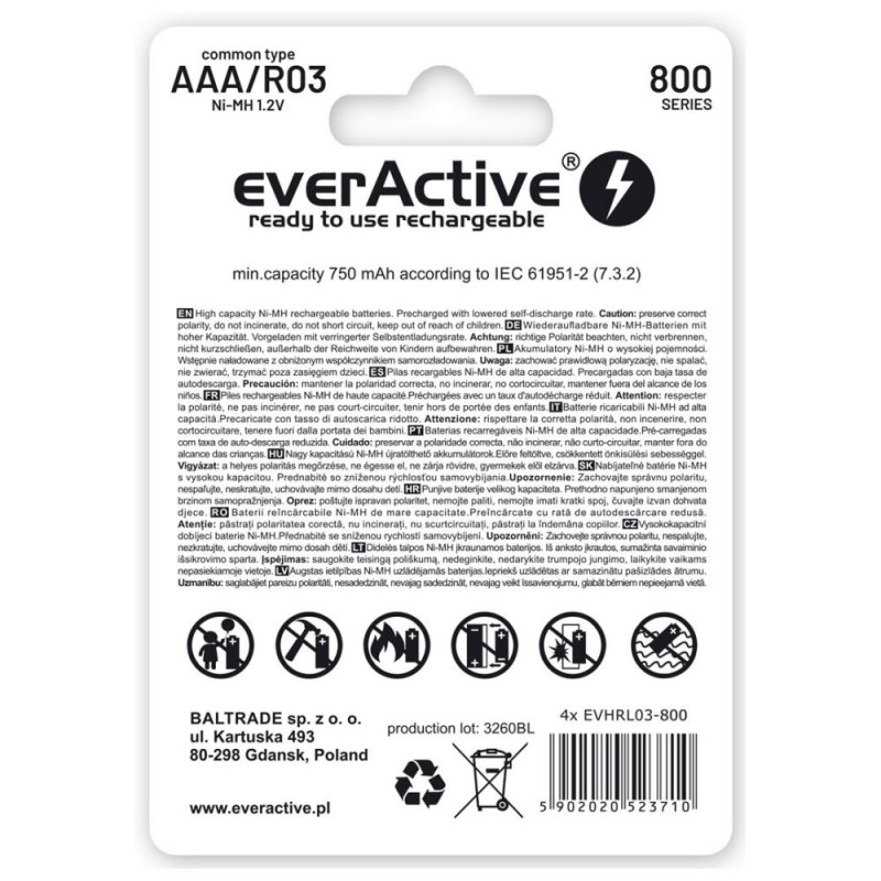 Lae oma seadmed täis everActive Ni-MH R03 AAA laetavate akudega! See 2-pakk pakub 800 mAh mahutavust, tagades pikaajalise energia ja keskkonnasõbraliku mugavuse.