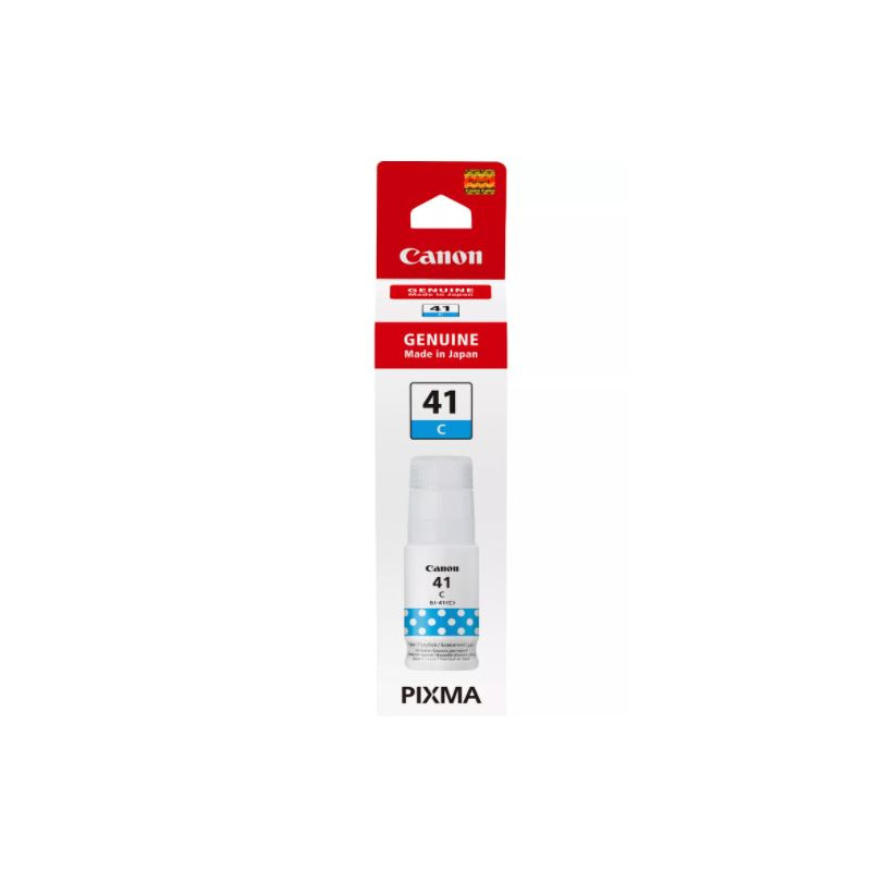 Lower the cost of printing per page and extend the time between top-ups with a high-yield ink of up to 7,700 pages¹ from a full set of colour ink refill bottles. Ideal for those who print high volumes of documents and images, enjoy high-quality results with crisp, sharp and vivid documents and photos. The enhanced ink bottle also eliminates wastage and spillage thanks to its innovative no-squeeze design which reduces mess. The key type nozzle ensures that you fill the right tank with the right bottle reducing any errors while refilling.<br><br>Extend the time between top-ups and lower the cost of printing per page with a 70 ml bottle of high-yield cyan ink<br><br>Print professional-looking documents with clear, sharp text thanks to Genuine Canon Ink<br><br>A key type ink nozzle provides mess-free and error-free use as each colour has their designated slots which means you won’t accidentally put the cyan ink bottle into the wrong ink tank<br><br>Print up to 7,700 pages¹ from a full set of colour ink refill bottles<br><br>Dye colour inks provide vivid images and photos<br><br>These no-squeeze ink bottles ensure an easy and simple ink refilling process and the ink stops when the tank is full – so there’s no waste of inkCanon GI-41C. Type: Original, Printing colours: Cyan, Brand compatibility: Canon. Quantity per pack: 1 pc(s)