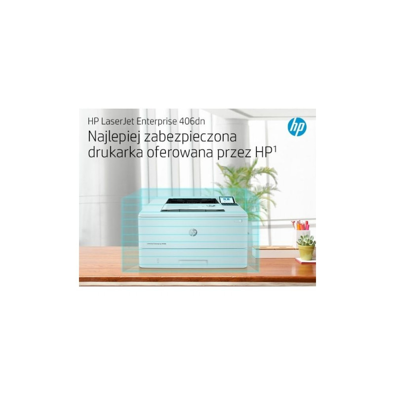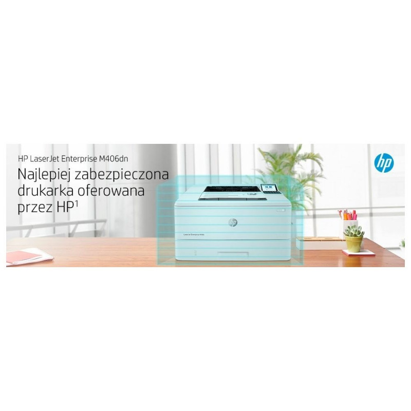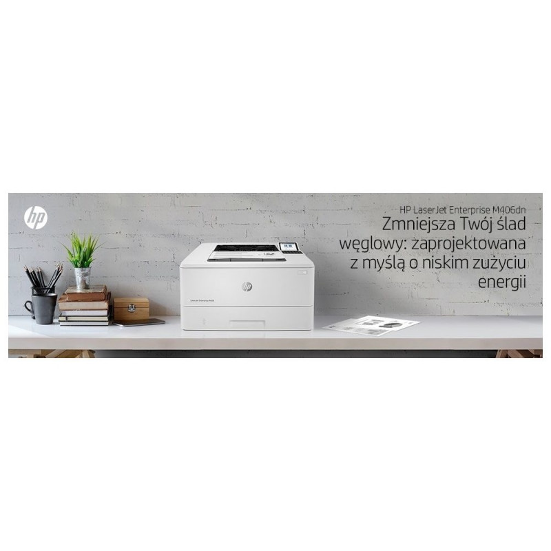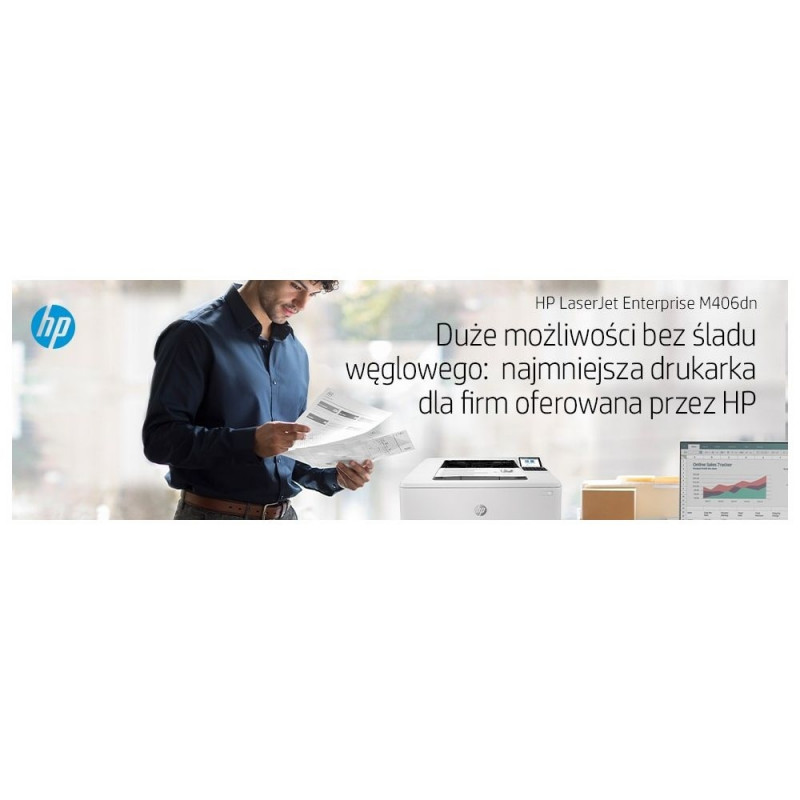 | Box contents | HP LaserJet Enterprise M406dn printer; HP Black Original LaserJet Toner Cartridge (~3,000 pages); Getting started Guide; 1 Power cord |