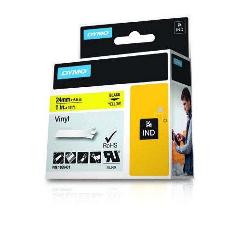 Ideal for both indoor and outdoor applications. Available in the widest range of colours that meet OSHA, ANSI and ISO colour standards.DYMO IND Vinyl Labels. Label colour: Black on yellow, Product colour: Multicolour, Material: Vinyl. Tape width: 2.4 cm, Tape length: 5.5 m, Package type: Box