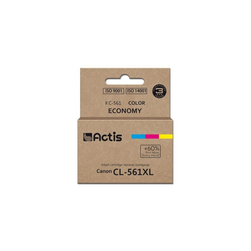 <b>Ink</b><br><br>Actis inks are the ideal choice for customers expecting the highest quality printouts.<br>Our inks are characterised by increased capacity in relation to original products and faithful colour reproduction.<br>Most Actis inkjet printheads are based on components from Europe.<br>Not only the printhead itself but also other components such as ink come from Europe.<br><br>Actis inks replace the most popular models for Hp, Lexmark, Epson, Brother, Canon printers. The products are available in two versions: Premium (brand new with regeneration technology) and Supreme (brand new based on new components). All inks undergo numerous quality tests applied at each stage of production.Actis KC-561 Canon printer ink, replacement Canon CL-561XL; Supreme; 18ml; blue, purple, yellow. Prints 60% more than the OEM.. Colour ink type: Dye-based ink, Cartridge capacity: High (XL) Yield, Supply type: Single pack, Colour ink volume: 18 ml, Printing colours: Blue, Purple, Yellow, Quantity per pack: 1 pc(s)
