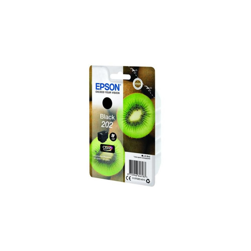 <b>Reduce your printing costs</b><br>Epson offers standard and extra large (XL) ink cartridges so that you can pick the best value option for your needs. XL inks are great if you print in high volumes and can help to reduce your printing costs. With both sizes, the colours are available individually so only the colour used needs to be replaced. That means less wastage and great value.<br><br><b>Meet the range</b><br>Epson’s Claria Premium 5-colour ink set is ideal for busy households who want the best of both worlds – high-quality document printing and outstanding, glossy photos. It combines pigment and dye-based inks with the additional benefit of a photo black ink. This means that as well as creating durable text documents, these inks produce high-quality photos. What’s more, photos printed with this ink can last up to 300 years in a photo album1, ensuring your treasured memories are protected for generations.<br><br><b>Optimised for Epson printers</b><br>Epson inks and papers have been developed to work hand-in-hand with Epson printers to produce the best results time and time again.<br><br><b>The genuine article</b><br>Enjoy hassle-free and reliable printing with Epson's genuine inks. We invest in extensive research, high-tech manufacturing facilities and put our products through rigorous tests, to deliver the best quality product to you.Epson Kiwi Singlepack Black 202 Claria Premium Ink. Cartridge capacity: Standard Yield, Black ink type: Pigment-based ink, Black ink volume: 6.9 ml, Printing colours: Black, Quantity per pack: 1 pc(s), Black ink page yield: 250 pages
