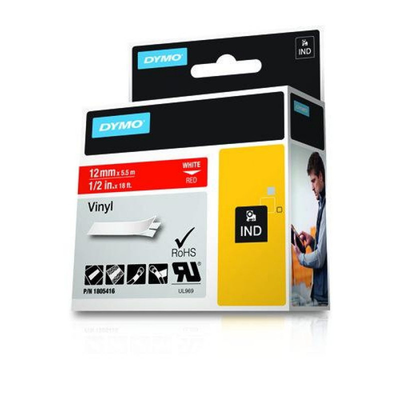 Ideal for both indoor and outdoor applications. Available in the widest range of colours that meet OSHA, ANSI and ISO colour standards.DYMO IND Vinyl Labels. Label colour: White on red, Product colour: Multicolour, Material: Vinyl. Tape width: 1.2 cm, Tape length: 5.5 m, Package type: Box
