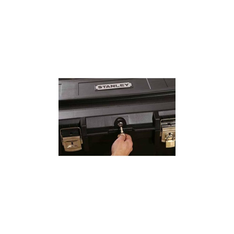 Wide telescopic steel handle with soft grip,<br><br>Removable tote tray fits neatly into the telescopic handle<br><br>Heavy duty road tested wheels<br><br>Butterfly screws on top lid for attaching level, hand saw and other accessories<br><br>Extra large rust resistant metal latches<br><br>Tools not includedStanley MOBILE Job Chest. Case type: Trolley case, Material: Metal, Plastic, Product colour: Black