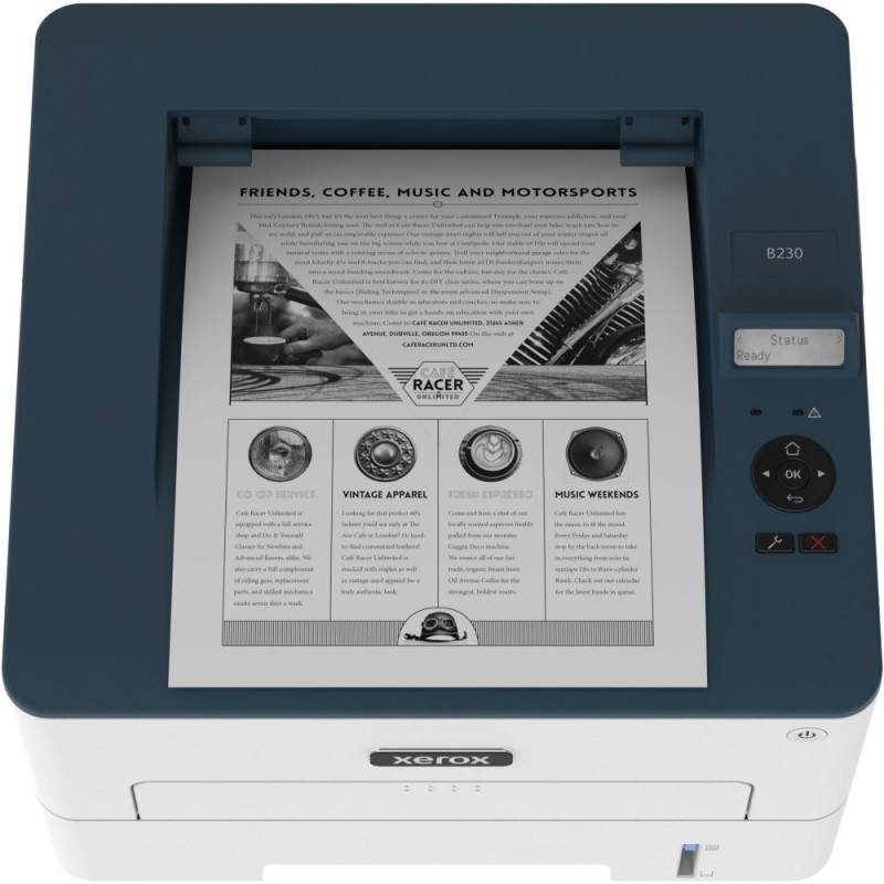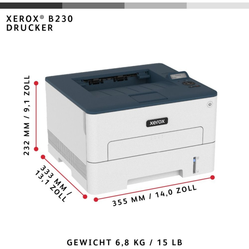 Xerox B230 A4 34 lehekülge/min. juhtmevaba kahepoolne printer PCL5e/6 2 sahtlit, kokku 251 lehte. Trükitehnoloogia: laser. Kassettide arv: 1, maksimaalne kuine töökoormus: 30 000 lehekülge kuus. Maksimaalne lahutusvõime: 2400 x 2400 DPI. ISO A-seeria maksimaalne paberiformaat: A4. Trükikiirus (mustvalge, tavaline kvaliteet, A4/US Letter): 34 lehekülge minutis, kahepoolne printimine. WLAN. Toote värvus: sinine, valge.