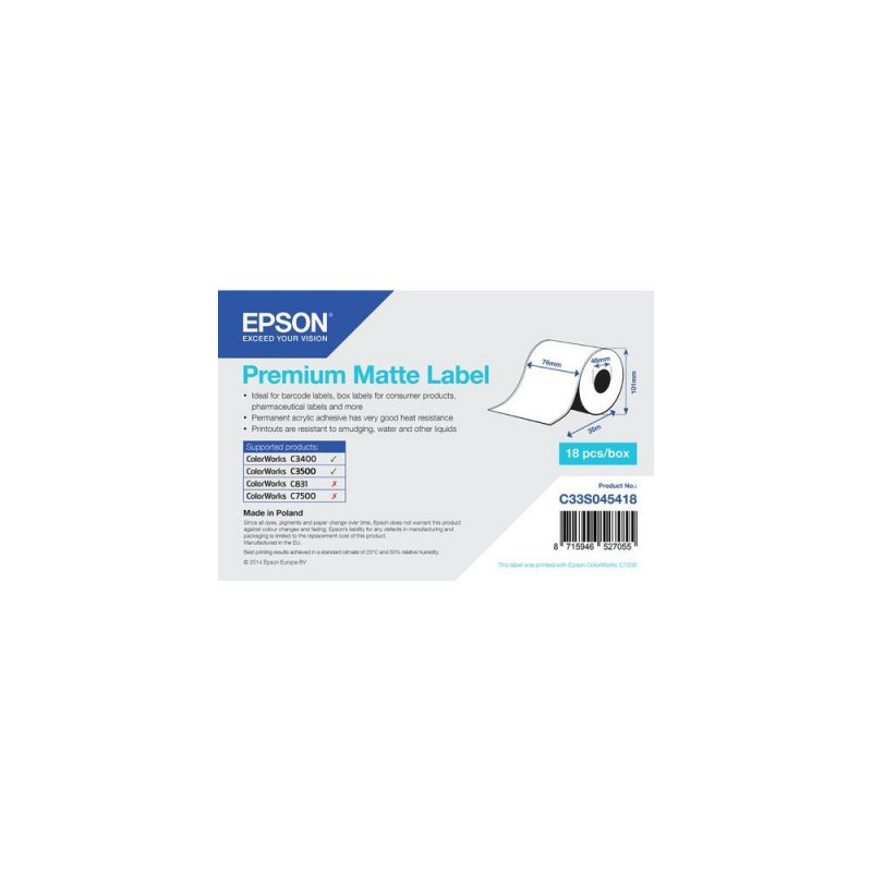 The smooth, bright white surface with a matte finish, in combination with Epson DURABrite Ultra pigment inks, ensures fast drying, scratch, water and heat resistance. The universal permanent acrylic adhesive enables trouble-free performance and good adhesion on a variety of surfaces and also at low temperatures.<br><br>Suggested applications<br>• Barcode labels<br>• Box labels for consumer products<br>• Parts assembly labels<br>• Shelf-edge labels in retail<br>• Pharmaceutical labels<br>• Sample labels in healthcare<br>• Shipping labelsEpson Premium Matte Label - Continuous Roll: 76mm x 35m. Finish type: Matte, Print media weight: 163 g/m². Quantity per pack: 1 pc(s), Package width: 113 mm, Package depth: 108 mm. Products per pallet: 648 pc(s), Pallet gross length: 120 cm, Pallet gross width: 80 cm. Country of origin: Poland