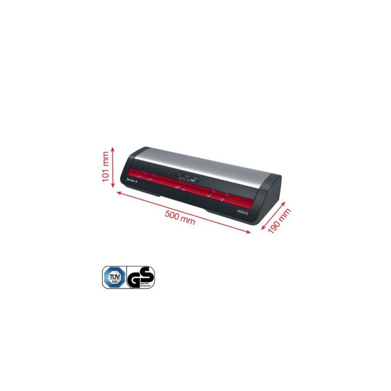 The GBC 480HS A3 Laminator provides a reliable and efficient solution for high volume laminating needs. Designed for professional environments, this high-speed laminating machine combines performance with ease of use. Boost productivity and reduce lamination time by 33% using GBC high-speed pouches. With a rapid 1-minute warm-up time, it laminates a 75-micron A4 sheet in just 23 seconds, making it ideal for fast-paced office tasks. The intuitive control panel offers four pouch thickness settings from 75 to 175 microns, providing flexibility for various document types. The panel also features a manual reverse button and an auto-reverse function with active jam sensing for seamless pouch removal. Additionally, the SMART status LED system provides clear visual and audible cues: red during warm-up, blue with a sound when ready, and an automatic shut-off after 15 minutes of inactivity to conserve energy. The SMART entry guide LEDs ensure straight pouch alignment to prevent jams, making every lamination perfect. Protect and preserve your important documents with speed and a smooth, professional finish every time. Black and red colour.GBC 480HS Office A3 Laminator. Maximum lamination width: 33 cm, Type: Hot laminator, Lamination speed: 800 mm/min. Power consumption (typical): 1400 W, AC input voltage: 220-240 V, AC input frequency: 50/60 Hz. Width: 500 mm, Depth: 190 mm, Height: 110 mm. Package width: 252 mm, Package depth: 559 mm, Package height: 170 mm. Country of origin: China