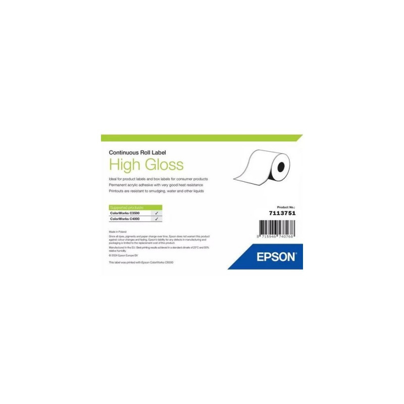Printed ink dries immediately and, with excellent moisture, heat and water resistance, a robust, long-lasting label is produced every time. A permanent acrylic adhesive ensures excellent adhesion to a wide variety of surfaces.Epson High Gloss Label, Continuous Roll, 76mm x 33m. Label type: Self-adhesive printer label, Type: Die-cut label, Format: Roll. Sheet width: 7.6 cm, Sheet length: 33 m, Roll length: 33 m. Quantity per pack: 1 pc(s), Package width: 113 mm, Package depth: 108 mm. Products per pallet: 648 pc(s), Pallet gross length: 120 cm, Pallet gross width: 80 cm