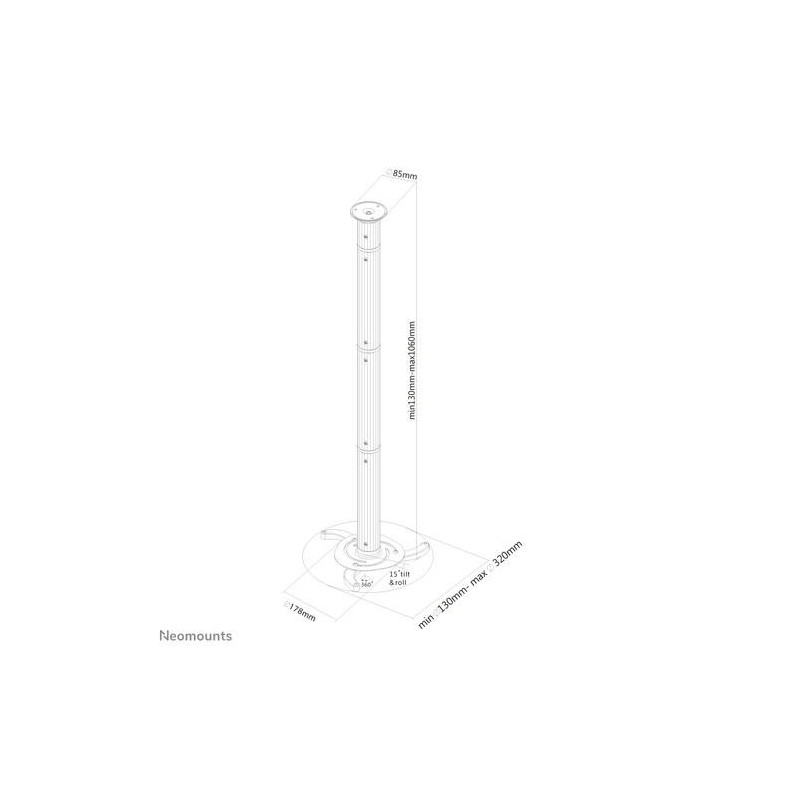The Neomounts projector ceiling mount, model BEAMER-C200 is a universal tilt-, swivel and/or rotatable ceiling mount for projectors up to 15 kilograms. This mount is a great choice for an optimal viewing experience. This versatile, ready to install mount, offers the convenience of installation to the ceiling without the need of additional accessories.<br><br>Neomounts versatile tilt (15°), rotate and/or swivel (360°) technology allows the mount to change to any viewing angle to fully benefit from the capabilities of the projector. The mount is height adjustable from 13 to 106 centimetres. An innovativemanagement conceals and routes cables from ceiling to projector. Hide your cables to keep the installation nice and tidy.<br><br>Neomounts BEAMER-C200 has two pivot points and is suitable for most projectors. The weight capacity of this product is 15 kilograms. This universal ceiling mount is easy to install and suitable for projectors using the mounting holes on the bottom side of the projector. The legs included with this mount, cover most projector hole patterns. The quick release function of the bracket offers safe storage of expensive projectors which results in decrease of theft.<br><br>Different poles available, models BEAMER-P100, BEAMER-P150 and BEAMER-P200, to stretch the distance between ceiling and projector from 100 to 200 centimetres.<br><br>Projector mounts are ideal for use in offices, schools, hospitals or at home. <br><br>All installation material is included with the product.Neomounts projector ceiling mount. Mounting type: Ceiling, Maximum weight capacity: 15 kg, Product colour: Silver. Height: 1060 mm, Weight: 2.08 kg, Package width: 370 mm. Country of origin: China. Products per master (outer) case: 6 pc(s), Master (outer) case net weight: 14.2 kg, Products per pallet (EU): 96 pc(s). Package net weight: 2.4 kg