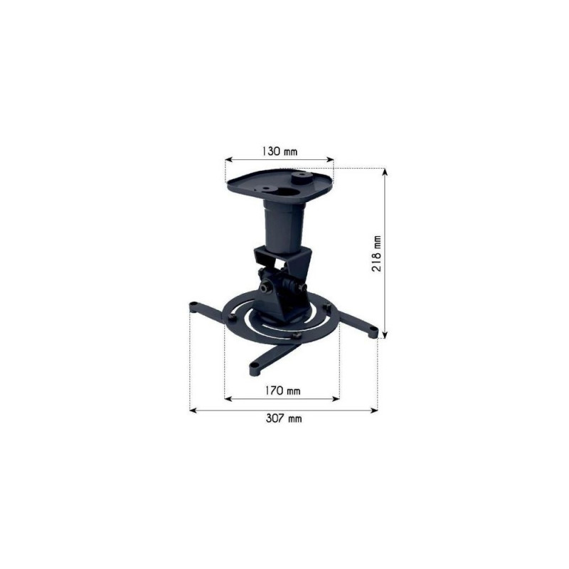 ICA PM-100 BK is a universal ceiling support for projectors up to 10 kg. It provides a multidirectional positioning with four support arms adjustable that can adapt to a wide range of mounting holes. The cables required for the installation pass in the middle column and therefore are not visible. This media projector is perfect for use in classrooms, meeting rooms, hotels, bars and restaurants and much more.<br><br><b>Characteristics</b><br>- Universal bracket ceiling projector;<br>- Compatible with most projectors on the market;<br>- Maximum weight supported: 10 kg.<br><br><b>Technical specifications</b><br>- Ceiling mount for projectors;<br>- With 4 support arms adjustable;<br>- Material: Aluminum;<br>- horizontal inclination: 180°;<br>- Vertical Tilt: 180°;<br>- Rotation: 360°;<br>- With cable management system;<br>- Finish: powder coating;<br>- Black Colour.<br><br><b>Dimensions</b><br>- Base width: 130 mm;<br>- Depth base: 130 mm;<br>- Height: 218 mm;<br>- Width mounting bracket: 307 mm.<br><br><b>Package Contents</b><br>- Ceiling mount for projectors;<br>- Mounting screws;<br>- User manual.Techly Universal Ceiling Bracket for Projector, Black ICA-PM 100BK. Mounting type: Ceiling, Maximum weight capacity: 10 kg, Product colour: Black. Height: 218 mm, Depth (min): 17 cm, Depth (max): 30.7 cm