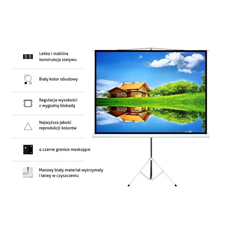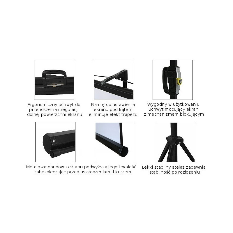 | Other features | - Tripod stand is made of lightweight and durable alloy- Excellent presentation and business school- Fast and easy way of folding and unfolding of the screen thanks to the spring-loaded- Screen after winding is well protected in a robust metal chamber- Ad |