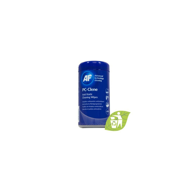 A general purpose resealable tub of impregnated, anti-static cleaning wipes can be used on all glass and plastic surfaces of pc and office equipment. Made from fully recyclable paper to encourage an eco conscious cleaning effort. Compatible with office and home working environments. Convenient re sealable tub locks in the freshness of the wipes for future use. For best results use alongside AF Safetiss STI200 to polish surface after cleaning. Key points: * Alcohol Free * Anti-Static * General purpose * Re sealable tub to lock in freshness * Fully recyclable paper wipes Suitable For: *Keyboards *Plastic surfaces *Mice, Printers *Fax Machines *games controllers *plastic casings of VR headsets *PC and Office equipment