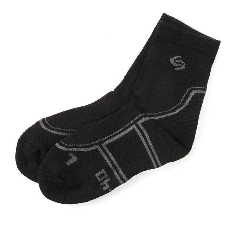 Socks for Nordic walking and trekking. A three-layer, contoured inner terry cloth absorbs shock and protects sensitive areas of the foot from abrasion and injury. The unique, innovative construction of COOLMAX ® yarn fibers ensures maximum comfort by maintaining the right temperature and wicking moisture away. This ensures the foot is in contact with soft, always dry fabric. If the socks get wet, they dry much faster than cotton socks, which is crucial when using them in extreme conditions. The socks are designed to fit the anatomical shape of the left (L) and right (R) feet thanks to a specially contoured terry cloth section. LYCRA ® throughout the product ensures excellent adhesion to the foot. An elastic band at the midfoot prevents the sock from shifting during movement. The specially contoured knit fabric at the heel ("Y" shape) perfectly fits the foot and stabilizes the sock. Crosswise ribs facilitate the sock's adjustment to the bend of the leg. The non-load-bearing portion of the sock above the foot is thinner, which, combined with the COOLMAX® yarn, significantly accelerates moisture wicking. Comfort is enhanced by a flat, soft "Rosso" seam above the toes. The SANITIZED® finish provides effective antibacterial, antifungal, and anti-odor properties.