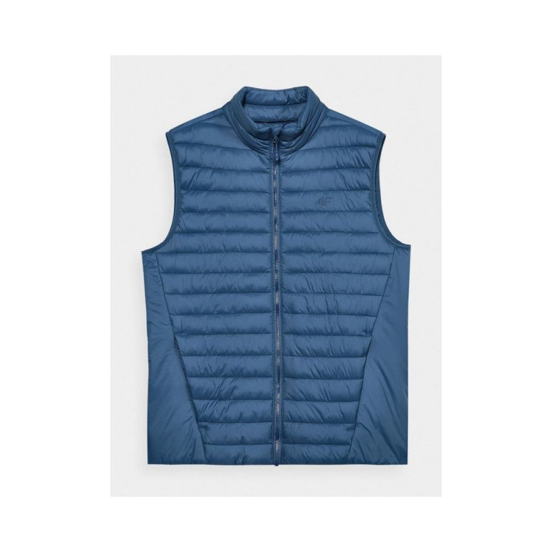 Men's 4F M062 Vest Blue 4FAW23TVESM062 32S This men's 4F vest is perfect for everyday wear. Unlined. Zippered side pockets. Comfortable collar for wind protection. Internal elastic at the bottom. Armholes finished with elastic trim. Hydrophobic impregnation of the material limits the absorption of external moisture. Main zipper with internal wind flap and chin guard. Synthetic down filling ensures optimal thermal comfort during use. Technical data: Main material: 100% polyester Main material: 100% additional Filling: 100% polyester