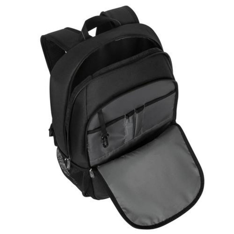 Stylishly carry your workday essentials with the Targus® 15-16” Modern Classic Backpack. Equipped with multiple pockets and ample storage, the main padded compartment safeguards your laptop from the inside, while lockable zippers help keep your gear safe from the outside. The lightweight bag features form and function with a standable design for easy loading, spacious 19L capacity, built-in workstation, and two easy-access water bottle pockets.<br><br>This bag is made for an ultra-comfortable carry with padded, contoured shoulder straps and a padded back, while its breathable mesh fabric helps keep you cool on those long days of wear. It even has a trolley strap to slip onto your rolling luggage. Its classic silhouette is appealing to both professionals and commuters and truly makes this bag the perfect companion whether you’re on-the-go for work or leisure.<br><br><b>Protection From the Inside Out</b><br>A padded laptop compartment protects your tech from the inside, while lockable zippers on the main compartment help deter theft on the outside.<br><br><b>Stay Hydrated and Stay Organised</b><br>No need to dig to the bottom of your bag for a drink, keep your water bottles in their designated pockets, or have snacks handy in the exterior pocket for that midday lull. This bag allows easy access to your laptop and other necessities to help you make the most of your day.Targus TBB943GL. Backpack type: Casual backpack, Product main colour: Black, Coloration: Monochromatic. Width: 335 mm, Depth: 105 mm, Height: 450 mm. Material: Polyester