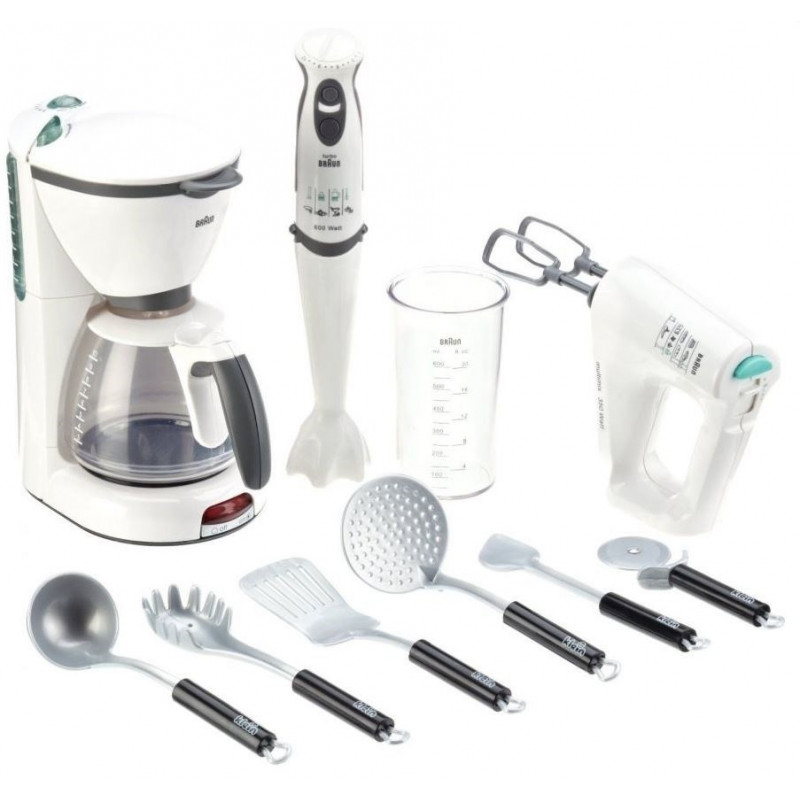 Komplekti kuuluvad: kohvimasin (töötab patareidega), blender (töötab patareidega), mikser (töötab patareidega), dosaator, pitsalõikur, pastalusikas, kulp. Seadmed teevad realistlikke helisid ning kohvimasinasse saab vett valada.