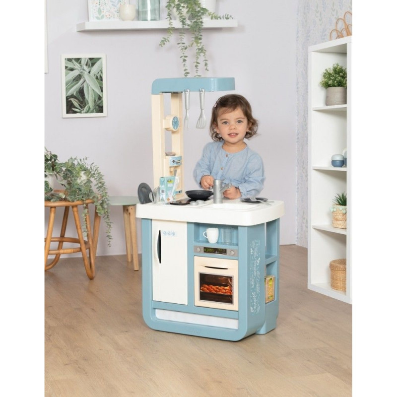 Elektrooniline köök heliefektidega – kokkamise heli, palju mänguruumi – tööpind, kraanikauss, kohvimasin, külmkapp, ahi, riiulid, komplektis 23 tarvikut.
