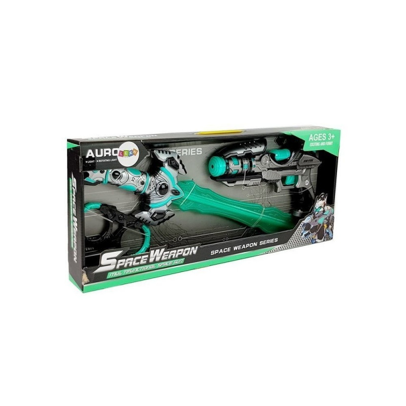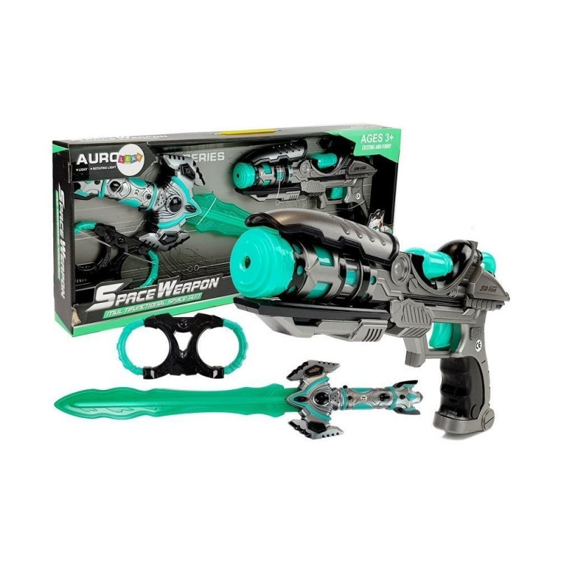 Kosmilise relva komplekt, mis on ideaalne rekvisiit, et pidada lahing ohtliku vaenlasega kaugelt planeedilt. See ainulaadne ja originaalne relv teeb kosmilisi helisid ja vilgub tuledega, mis kindlasti innustab kõiki lapsi mängima. Kosmiline lahinguvahend koosneb mitmest elemendist. Komplekti värvigamma hõlmab järgmisi toone: hõbedane, must, türkiissinine. Mõõk ja püstol süttivad ja teevad helisid, kui need sisse lülitada, seetõttu tasub mänguasja proovida pimedas ruumis, mis annab hämmastavaid efekte. Ideaalne komplekt mängimiseks eakaaslastega ja lahinguteks kosmilisel planeedil.