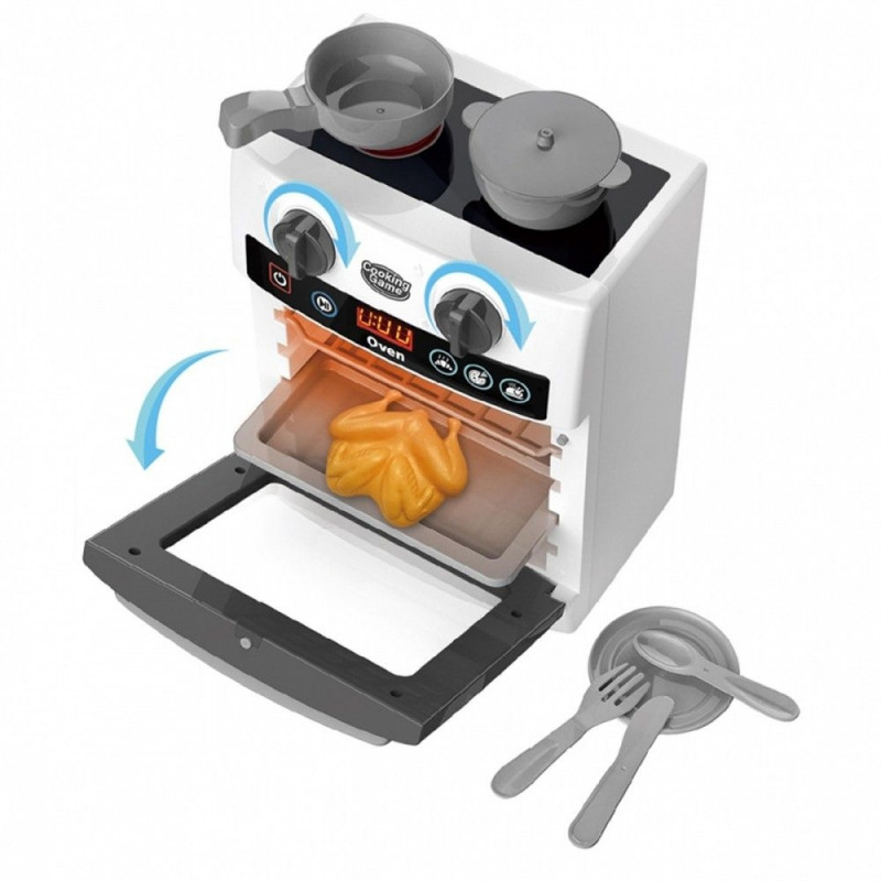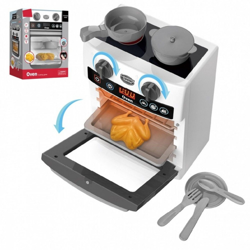 Tutvu ahjuga köögiga, mis jäljendab tõelisi kodumasinaid – see süttib ja teeb realistlikke helisid. Kui vajutada nuppu ON ja valida üks kolmest režiimist, algab vahva mäng. Ahi süttib ning köök hakkab kostma ehtsaid helisid. Ülal on kaks pliidipõletit ja kaks nuppu, mis keeramisel teevad iseloomulikku klõpsu.