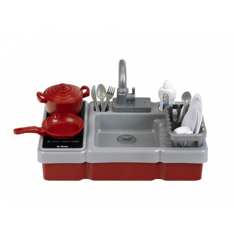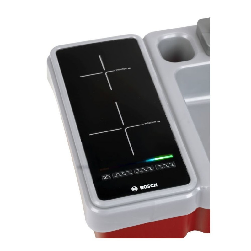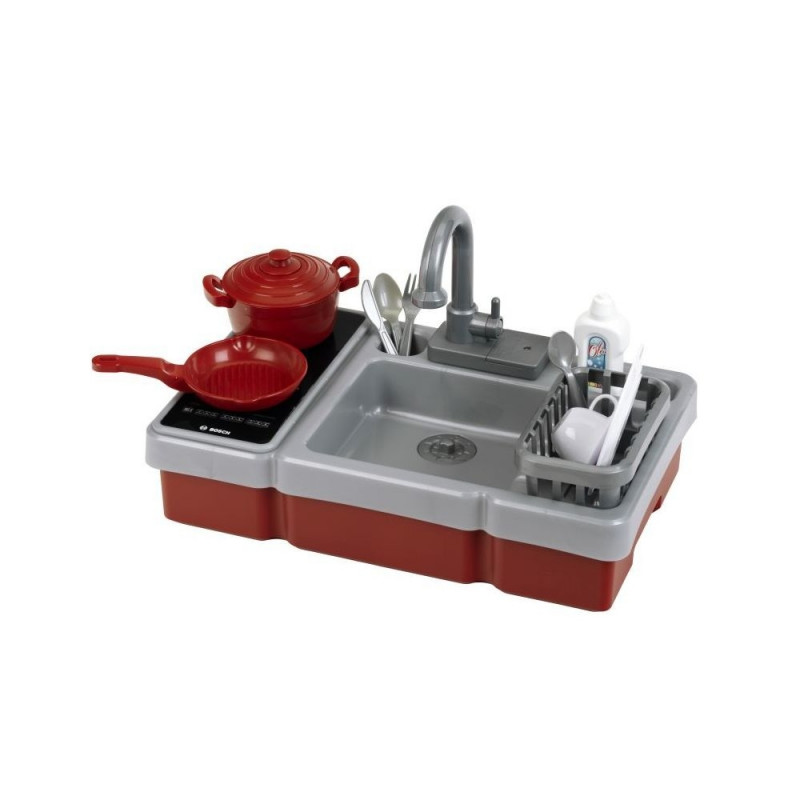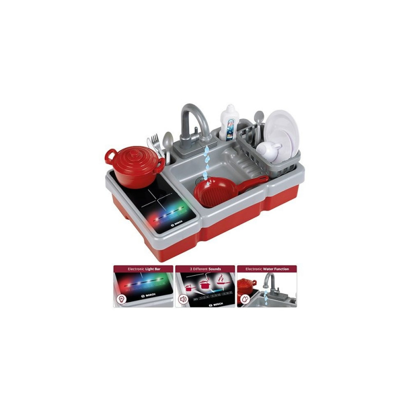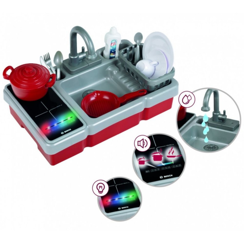 See populaarse Boschist inspireeritud disainiga miniköök sisaldab veepumba funktsiooniga kraani, valguse ja helidega pliidiplaati ning palju tarvikuid: täiskomplekti potte, nõusid, söögiriistu ja nõudekuivatusresti. Toidu valmistamine ja serveerimine, nõude pesemine ning koristamine arendavad laste loovust ja motoorseid oskusi – eriti kui kõik toimub nii lõbusal ja kujutlusvõimelisel moel.