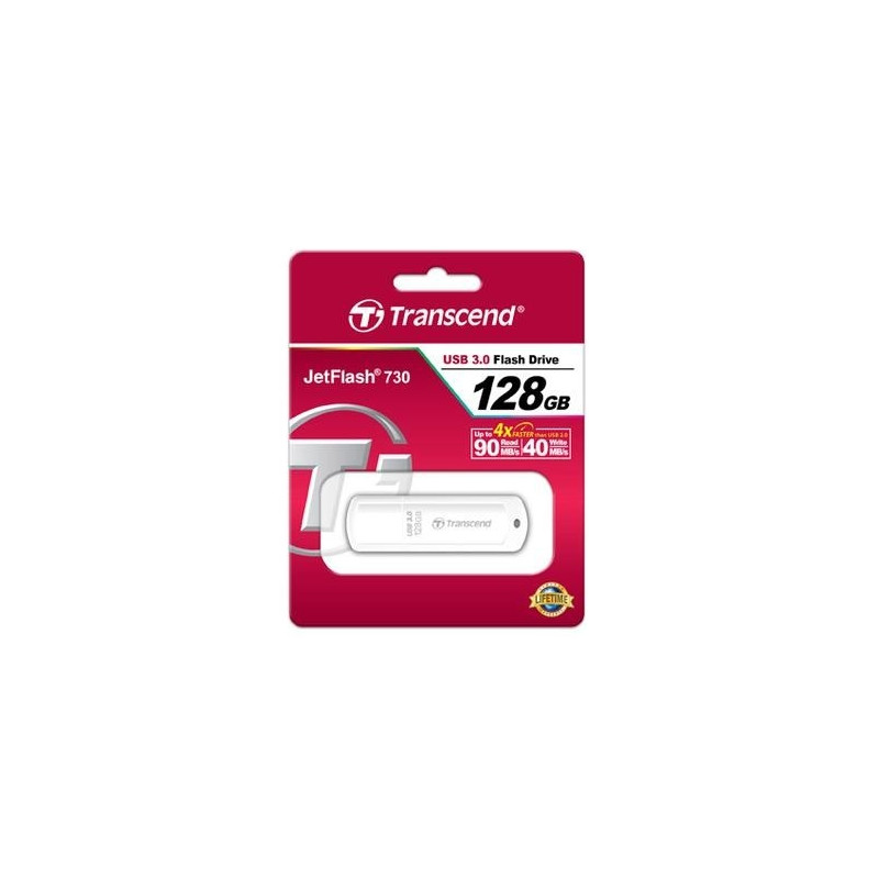 The JetFlash 700/730 supports USB 3.1 Gen 1 standard, making it much easier to get access to your rich digital content. With a combination of speed and beauty, the JetFlash 700/730 is a perfect entry-level USB 3.1 Gen 1 peripheral for those who demand stylish aesthetics with leading technology.<br><br><b>Sleek and glossy on your fingertips</b><br>Transcend's JetFlash 700/730 comes in sleek piano-black. Being stylish and speedy, the JetFlash 700 is perfect for those fashion-minded!<br><br><b>Up to 128GB capacity</b><br>Transcend's JetFlash 700/730 come in up to 128GB capacious storage, allowing you to store as many files as you wish!Transcend JetFlash 730 128GB. Capacity: 128 GB, Device interface: USB Type-A, USB version: 3.2 Gen 1 (3.1 Gen 1). Form factor: Cap. Weight: 8.5 g. Product colour: White