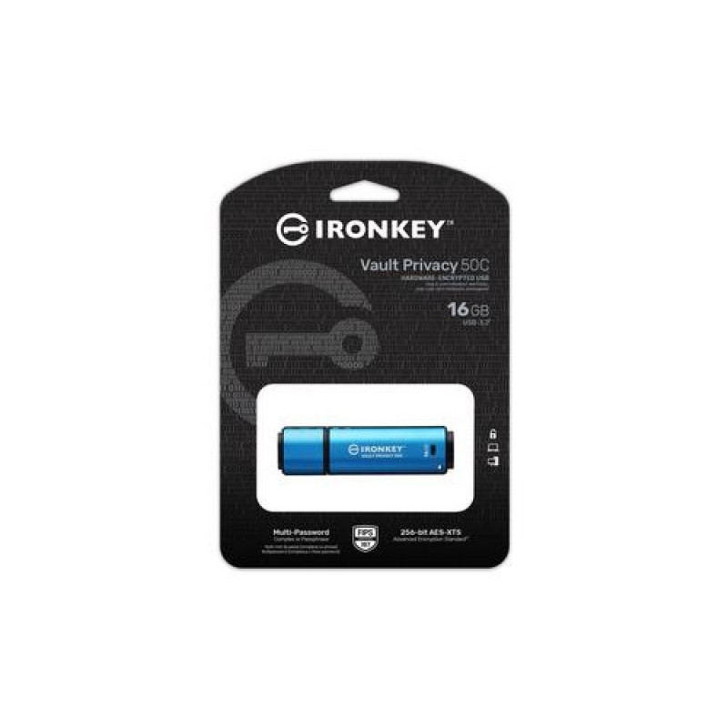 Kingston IronKey™ Vault Privacy 50 series are premium USB Type-A and USB Type-C®* drives that provide enterprise-grade security with FIPS 197 certified AES 256-bit hardware-encryption in XTS mode, including safeguards against BadUSB with digitally-signed firmware and against brute force password attacks. VP50 has been penetration tested***** (pen tested) for enterprise-grade security. Because it provides encrypted storage under the user’s physical control, the VP50 series is superior to using the internet and Cloud services to safeguard data.<br><br>Vault Privacy 50 supports multi-password options (Admin, User and One-Time Recovery) with Complex or Passphrase modes. This enhances the ability to recover access to the data if one of the passwords is forgotten. Traditional Complex mode allows for passwords from 6-16 characters using 3 out of 4 character sets. The new Passphrase mode allows for a numeric PIN, sentence, list of words or even lyrics from 10 to 64 characters long. Admin can enable a User and a One-Time Recovery password, or reset the User password to restore data access. To aid in password entry, the “eye” symbol can be enabled to reveal the typed-in password, reducing typos that lead to failed login attempts. Brute force attack protection locks out User or One-Time Recovery passwords if 10 invalid passwords are entered in a row, and crypto-erases the drive if the Admin password is entered incorrectly 10 times in a row.<br><br>To protect against potential malware on untrusted systems, both Admin and User can set Read-Only mode to write-protect the drive; additionally, the built-in virtual keyboard shields passwords from keyloggers or screenloggers.<br><br>Organisations can customise and configure VP50 series drives with a product ID (PID) for integration with standard endpoint management software to meet corporate IT and cybersecurity requirement through Kingston’s Customisation Programme.<br><br>Small and medium businesses can use the Admin role to manage their drives locally, e.g. use admin to configure or reset employee User or One-Time Recovery Passwords, recover data access on locked drives and comply with laws and regulations when forensics are required.<br><br>Vault Privacy 50 offers fast dual-channel performance on all capacities. The drive is waterproof with IPX8 rating****, TAA compliant and assembled in the USA.<br><br><b>Hardware-encrypted USB drive for data protection</b><br>Safeguard important data with FIPS 197 certified XTS-AES 256-bit encryption. Built-in protections against BadUSB, brute force attacks and pen tested for enterprise-grade security.<br><br><b>Multi-password option for data recovery</b><br>Enable Admin, User and One-Time Recovery passwords. Admin can reset a User password and create a One-Time Recovery password to restore User’s access to data. Brute force attack protection locks out User or One-Time Recovery passwords if 10 invalid passwords are entered in a row, and crypto-erases the drive if the Admin password is entered incorrectly 10 times in a row.<br><br><b>New Passphrase mode</b><br>Select between Complex or Passphrase password mode. Passphrases can be a numeric PIN, sentence with space characters, list of words or even lyrics – from 10 to 64 characters long.<br><br><b>Dual read-only (write-protect) settings</b><br>Avoid malware attacks with a forced Read-Only mode set by Admin for User, or a session-based Read-Only mode set by Admin or User.<br><br><b>Locally manage drives for small and medium businesses</b><br>Use Admin role to locally manage employee User and One-Time Recovery passwords, recover data access on locked drives, and comply with laws and regulations when forensics are required.<br><br><b>Additional security features</b><br>Reduce failed login attempts and frustration by enabling “eye” button to view the password typed. Use virtual keyboard to shield password entry from keyloggers and screenloggers.Kingston Technology IronKey 16GB USB-C Vault Privacy 50C AES-256 Encrypted, FIPS 197. Capacity: 16 GB, Device interface: USB Type-C, USB version: 3.2 Gen 1 (3.1 Gen 1), Read speed: 250 MB/s, Write speed: 180 MB/s. Form factor: Cap. Password protection. Weight: 15 g. Product colour: Black, Blue