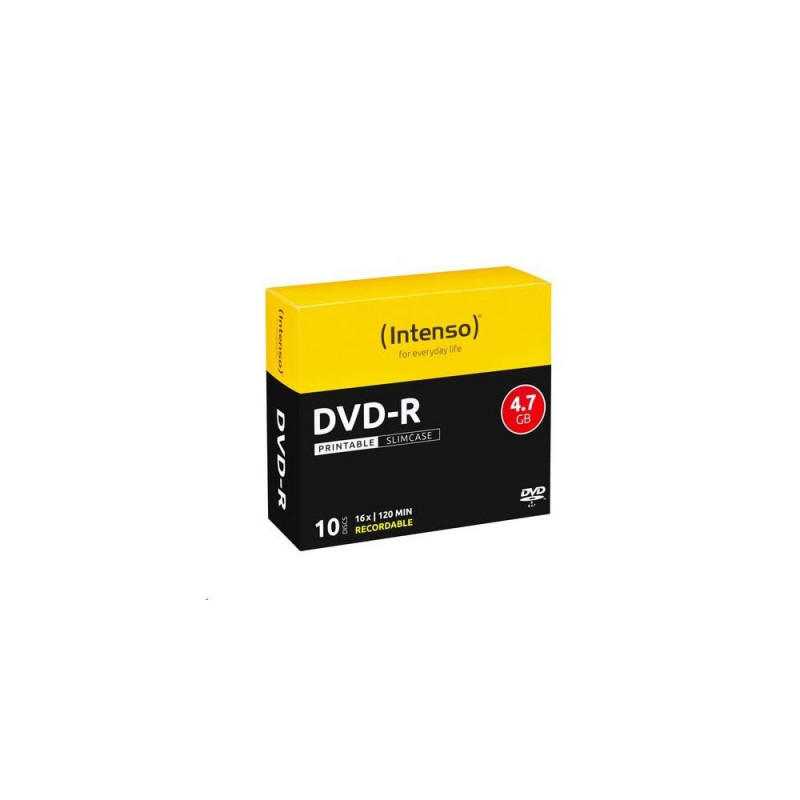 <b>Intenso DVD-R printable</b><br><br>Capacity: 4.7GB<br>Recording Time: 120 min<br>Speed: 16x<br>Pack style: slimcase 10pcs<br>PrintableIntenso DVD-R 4.7GB, Printable, 16x. Native capacity: 4.7 GB, Type: DVD-R, Quantity per pack: 10 pc(s). DVD-R write speed: 16x. Package type: Slimcase. DVD write speed: 16x