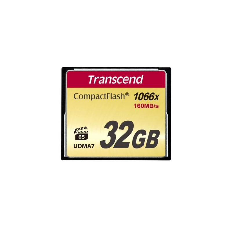 To ensure high-quality image and video capture with today's cutting-edge digital equipment, Transcend's CompactFlash 1000 memory cards meet CompactFlash 6.0 specifications, offering incredible high-speed performance and impressive storage space. The CompactFlash 1000 cards implement the Video Performance Guarantee (VPG-65) to enable professional-quality video recording without dropping frames, even in 3D. The top-tier MLC NAND flash chips inside are durable and reliable.<br><br><b>A trusted choice</b><br>Transcend's CompactFlash 1000 memory cards are manufactured with top-tier MLC NAND flash memory, making them durable and reliable. Ideal for use with advanced cameraholders and DSLR cameras for news, sports, wildlife, and action photography, these cards come in particularly handy during continuous burst mode shooting and lengthy Full HD, 3D, or even 4K UHDTV (2160p) video recording, offering professional photographers and videographers impressive transfer rates and stable video recording without dropping frames.<br><br><b>Shoot at amazing transfer speeds</b><br>Transcend's CompactFlash 1000 memory cards meet the VPG-65 (Video Performance Guarantee) standard to ensure a sustained minimum write speed of 65MB/s. With read/write speeds of up to 160MB/s and 120MB/s respectively, you can enjoy lag-free and cinima-quality Full HD, 3D, or 4K video.<br><br><b>Get larger storage capacity</b><br>With up to 128GB storage capacity, Transcend's CompactFlash 1000 memory cards allow for thousands of photos and tens of hours of Full HD videos to be recorded. Supporting UDMA7 (high-speed Ultra DMA transfer mode 7), the cards offer not only prompt response during fast-action burst mode shooting, but also fast storage of large images in the RAW format. Stay focused on capturing crucial moments, and let the memory card handle the rest.<br><br><b>Built for extremes<b><br>Transcend's CompactFlash memory cards are tested to withstand extreme conditions. The CompactFlash 1000 memory cards can operate in temperatures ranging from -25°C (-13°F) to 85°C (185°F), delivering the best performance and stability.<br><br><b>RecoveRx software</b><br>Transcend offers exclusive RecoveRx software, a free data recovery utility that allows you to search deep within a storage device for traces of erased files including digital photos, documents, music and videos.Transcend CompactFlash 1000x 32GB. Capacity: 32 GB, Flash card type: CompactFlash, Internal memory type: MLC, Read speed: 160 MB/s, Write speed: 120 MB/s. Product colour: Black