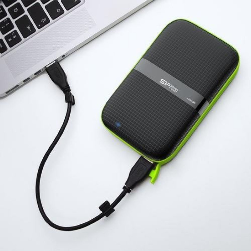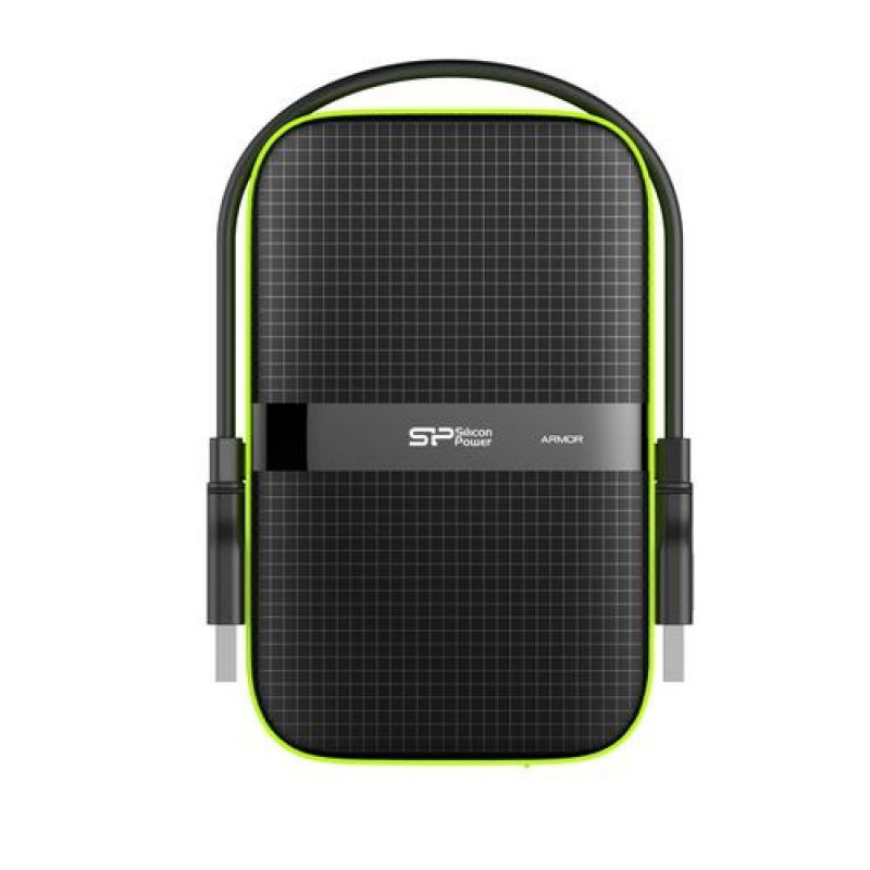 <b>Powerful gear featuring shockproof and water-resistant functions</b><br><br><b>Shockproof & Water-resistant</b><br>Armor A60 incorporates ultra-rugged rubber casing and internal suspension system, which enable perfect buffer effect and assure rigid protections against crushes, dust and spraying water.<br><br><b>Cable-carry design</b><br>The innovative slot design is especially equipped for simple cable carrying and storing by which users can easily wrap the cables around the drive.<br><br><b>Anti-slip, Anti-scratch</b><br>Armor A60 exercises the special surface texture that can not only allow anti-slip function but also keep the drive from damages caused by fingerprints and scratches.<br><br><b>SuperSpeed USB 3.1 Gen1 interface</b><br>The SuperSpeed USB 3.1 Gen1 (USB3.0) delivers outstanding read/write speed. It saves users' precious time to easily edit or store large files including graphics and HD videos.Silicon Power Armor A60. HDD capacity: 4 TB, HDD size: 2.5". USB version: 3.2 Gen 1 (3.1 Gen 1). Product colour: Black, Green