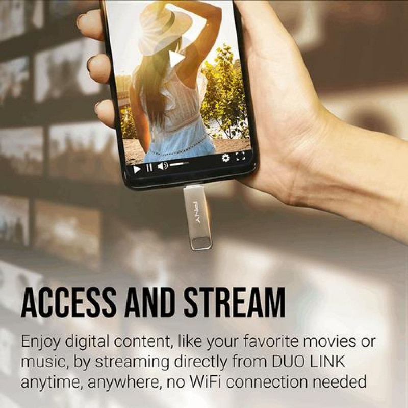 The PNY DUO LINK USB 3.2 Type-C Dual Flash Drive bridges the gap between mobile and desktop, making it the ideal mobile storage solution for file management on-the-go. DUO LINK is the perfect tool to free up space on Type-C equipped mobile devices by allowing users to move content such as photos, videos, music, and more from their smartphones and tablets to the drive, making room for more, and ensuring they will never miss an opportunity to capture content due to lack of memory. What’s more, the DUO LINK Dual Flash Drive allows for the transfer of content to full size devices such as laptop and desktop computers for permanent storage. With read speeds of up to 200MB/s and transfers up to 30x faster than USB 2.0, moving content from the drive to a computer is quick and easy. From there, users can take their content to the next level and create videos, social posts, process prints, or simply save their files on a more permanent storage device. The DUO Link USB 3.2 Type-C Dual Flash Drive is ideal for use across operating systems and host devices. With a USB 3.2 Type-C connector for Type-C Android mobile devices and newer gen PC & Mac laptop and desktop computers, and a USB 3.2 Type-A connector for previous gen computers, the potential for content creation and file management is near limitless.PNY DUO LINK. Capacity: 128 GB, Device interface: USB Type-A / USB Type-C, USB version: 3.2 Gen 1 (3.1 Gen 1), Read speed: 200 MB/s. Form factor: Swivel, Product colour: Stainless steel
