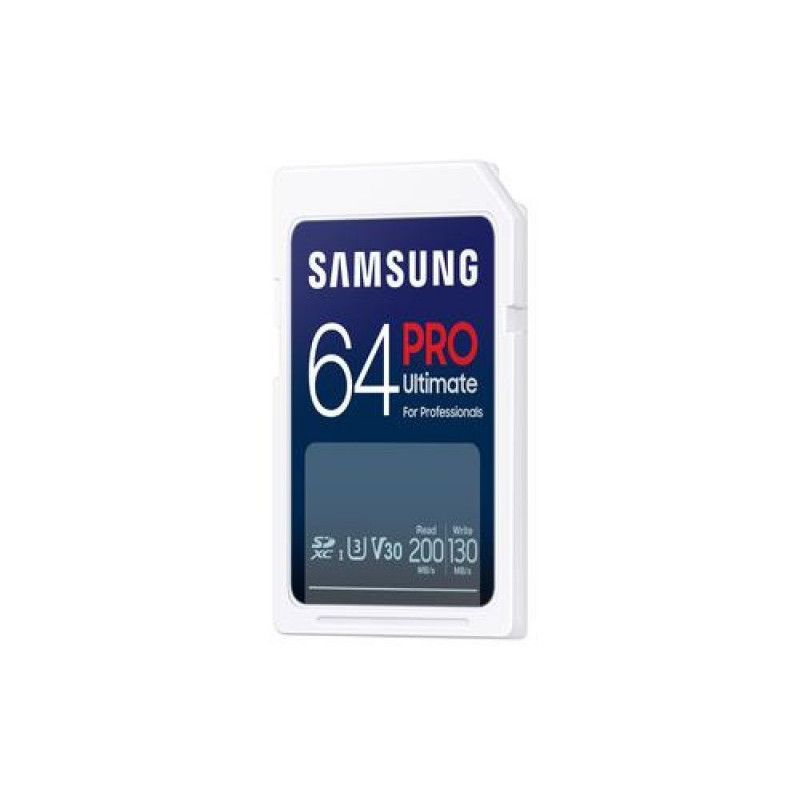 <br />Samsung PRO Ultimate. Capacity: 64 GB, Flash card type: SDXC, Flash memory class: Class 3, Internal memory type: UHS-I, Read speed: 200 MB/s, Write speed: 130 MB/s, UHS Speed Class: Class 3 (U3), Video Speed Class: V30. Protection features: Drop proof, Shock resistant, Temperature proof, Waterproof, X-ray proof, Product colour: White