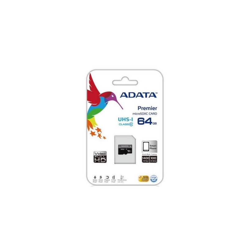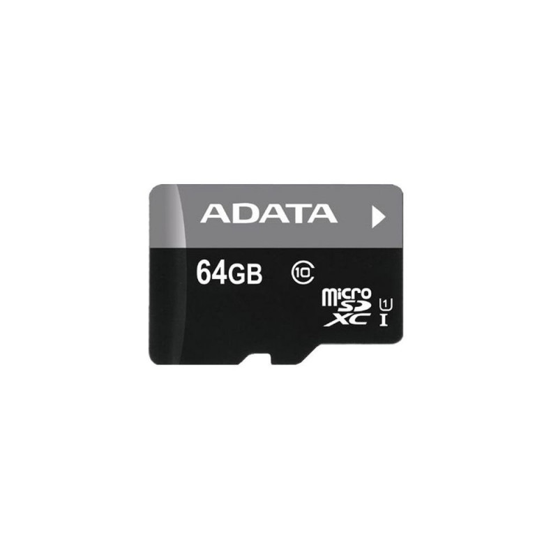 <b>Increased speed, no increase in cost</b><br>Premier microSDHC/SDXC UHS-I Class10 memory cards have higher capacity, but without a higher price, and provide consumers with the faster read speeds of UHS-I U1 specification at the price of a Class 10 card. Sequential reads are up to 30 MB/second, and write speeds reach the UHS-I speed class 1 specification. Random read and write IOPS are 1400 and 100 respectively. They are remarkably suitable for users who enjoy high definition photography and video recording. Running multiple applications simultaneously causes no loss in read/write speed.<br><br><b>Wide Range of Capacities</b><br>In addition to the 8, 16, 32, and 64 GB capacity options, a bundle option includes a single memory card and an SD adapter card, allowing for easy transfer of files to and from hardware.ADATA Micro SDXC 64GB. Capacity: 64 GB, Flash card type: MicroSDXC, Flash memory class: Class 10, Internal memory type: UHS, Read speed: 30 MB/s, Write speed: 10 MB/s. Product colour: Black
